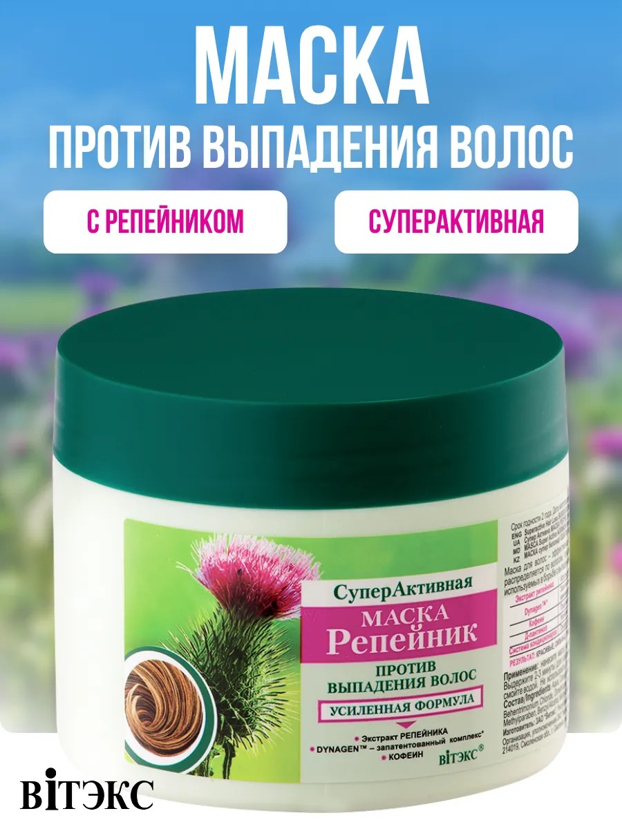 СуперАктивная маска Репейник против выпадения волос смываемая эффективное средство для интенсивного укрепляющего ухода за волосами. Легко наносится и хорошо распределяется по волосам, придает им упругость и блеск. Маска содержит усиленный комплекс эффективных компонентов, используемых в борьбе с выпадением волос. Экстракт репейника издавна славится своими уникальными свойствами. Косметические средства, разработанные на основе этого компонента, действенно приостанавливают процесс выпадения волос и дарят локонам силу и здоровье. Эта маска была разработана компанией Витэкс на основе комплекса растительных экстрактов и запатентованного компонента Dynagen, способствующего укреплению прядей и надежно защищающего волосы от выпадения. Действие препарата также было усилено кофеином, призванным оздоравливать волосяные луковицы и нормализовать рост здоровых волосков.
