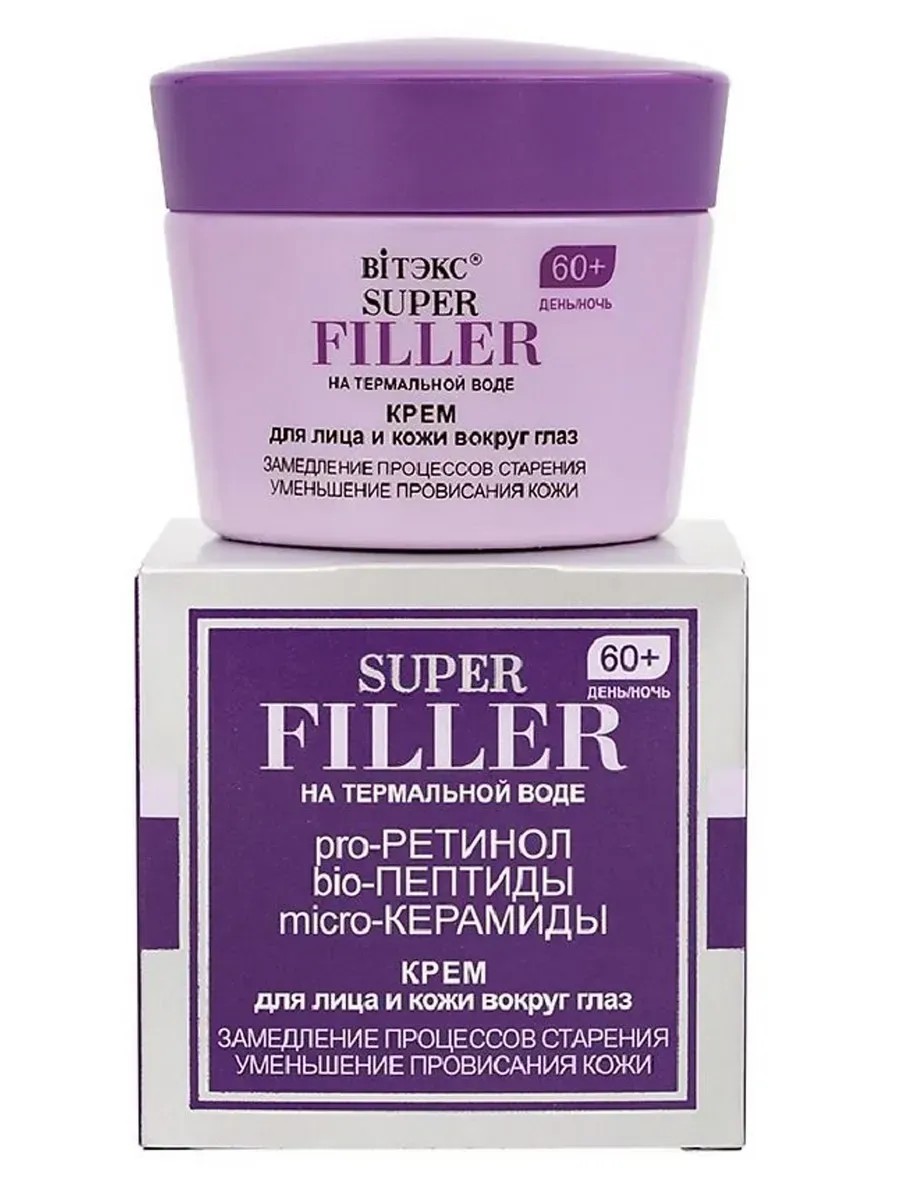 Витэкс Крем Super Filler для лица и кожи вокруг глаз 60+, 45 мл. Активная формула крема создана для стимуляции процессов обновления в эпидермисе, усиления выработки коллагена и эластина, минимизации морщин и уменьшения провисания кожи. Pro-активный ретинол сокращает мимические и глубокие морщины, bio-миметические пептиды подтягивают кожу и уменьшают провисание, micro Керамиды и термальная вода увлажняют кожу, укрепляют овал лица. Аденозин стимулирует выработку собственного коллагена, выравнивает рельеф кожи. Интенсивный омолаживающий коктейль из pro-активного ретинола, bio-миметических пептидов и micro-керамидов в сочетании с природной силой термальной воды помогает заметно улучшить упругость и плотность кожи, заполняет и «выталкивает» морщины, препятствует углублению существующих и появлению новых морщинок, укрепляет и подтягивает овал лица. Очень насыщенная, питательная текстура крема тает при нанесении на кожу, наполняет ее омолаживающими веществами, необходимыми для восстановления упругости, свежести и молодого сияния. Ценнейшие масла макадамии и ши, уникальный комплекс незаменимых липидов, витамин Е питают, восстанавливают и разглаживают кожу, выравнивают цвет лица. Гиалуроновая кислота в сочетании с натуральным увлажнителем NA PCA притягивает влагу из окружающей среды и запечатывает ее в коже, восстанавливая и поддерживая необходимый уровень увлажненности. Глицин тонизирует кожу, стимулирует клеточную регенерацию. Таурин замедляет разрушение коллагена, поддерживает упругость кожи, препятствует углублению существующих морщин и появлению новых.