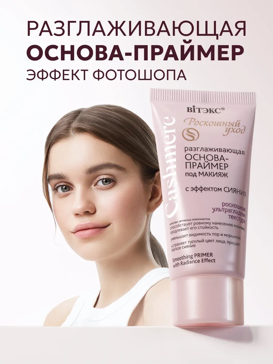 Experience luxury and pampering with the Cashmere Radiance Primer. Its ultra-smooth texture helps apply makeup evenly, minimizing the appearance of pores and wrinkles, and imparting a soft glow. Nourishing ingredients such as Alpine edelweiss cells and cashmere proteins create the perfect surface for makeup, extending its wear. Delicate pearlescent particles highlight facial features, while hydrating and smoothing agents leave skin smooth and supple. This product pairs perfectly with foundation, resists creasing, and keeps your makeup looking fresh all day. Treat yourself to perfect coverage, flawless makeup, and radiant skin with the Cashmere Primer! Cashmere Primer is a professional cosmetic product that helps even out skin tone, making it ideal for foundation application. This cream, created specifically for women, is suitable for both oily and dry skin, brightening it and giving it a snow-white complexion. This cosmetic helps improve skin elasticity, making it softer and smoother. Evening out skin tone is an important step in the makeup process, and our primer will help you do it like a pro. This product is ideal for girls and women with problematic skin, as it serves as an excellent makeup base, concealing all imperfections. Our primers are a decorative element that makes your makeup more beautiful and long-lasting. Cashmere makeup primer is more than just cosmetics; it's a popular facial care product. This pink face cream with a radiant effect gives skin a delicate, fresh glow. Belarusian makeup cosmetics are known for their quality and natural ingredients. Cashmere makeup primer is precisely the right cosmetic for women that helps fight wrinkles and improves skin elasticity. It's not just cosmetics, it's makeup that helps you look flawless every day.