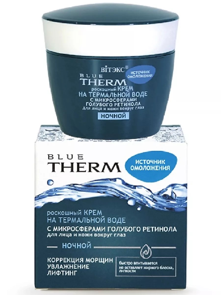 Luxurious Thermal Water Cream with Blue Retinol Microspheres for the Face and Eye Area. Night Wrinkle Correction, Hydration, and Lifting. This luxurious night cream features a rich texture for intense nourishment, hydration, and smoothing. The active ingredient complex has intense restorative and corrective properties, stimulating cell renewal overnight. Suitable for all skin types.