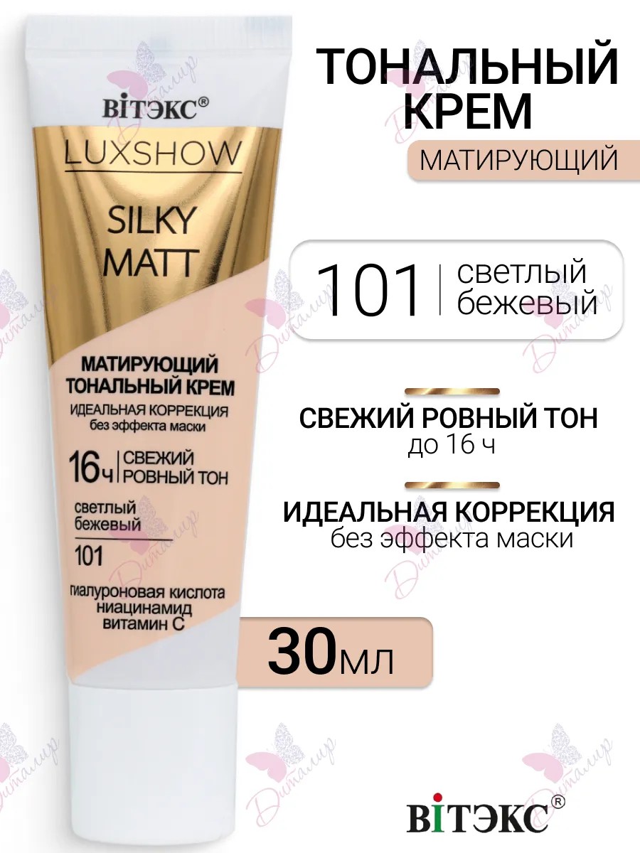 Luxshow silky matt матирующий тональный крем без эффекта маски. Идеальная коррекция без эффекта маски. Свежий ровный тон до 16 ч. Лаборатория красоты витэкс представляет роскошный матирующий тональный крем, который моментально делает кожу визуально совершенной. Поистине волшебная формула крема может все: идеально маскирует неровный тон, пигментацию, веснушки и другие несовершенства, матирует кожу, обеспечивает стойкость и свежесть тона до 16 часов. Крем настолько нежный и невесомый, что что вы забудете о том, что нанесли его на кожу. Роскошное бархатисто-матовое покрытие. Свежий ровный тон до 16 часов. Превосходная стойкость даже на жирной коже. Идеально наслаивается для максимальной степени маскировки несовершенств. Без эффекта маски на лице. Полноценный уход за кожей благодаря ниацинамиду, гиалуроновой кислоте и витамину с. В состав тонального крема входят специальные компоненты для интенсивного увлажняющего и антивозрастного ухода за кожей в течение всего дня. Низкомолекулярная гиалуроновая кислота глубоко проникает в кожу, поддерживает необходимый уровень увлажненности, помогает разгладить морщинки, вызванные обезвоживанием. Ниацинамид нормализует выработку себума, сужает поры, выравнивает тон, уменьшает пигментацию и следы постакне. Витамин с в стабилизированной форме осветляет кожу, улучшает выработку коллагена, оказывает выраженное антиоксидантное действие, обеспечивает защиту от преждевременного старения. Витамин е улучшает упругость и плотность кожи, помогает разгладить морщинки. Сразу после нанесения тонального крема кожа выглядит бархатисто-матовой, идеально ровной, гладкой и свежей, а несовершенства становятся абсолютно незаметными. Применение: нанесите средство непосредственно на кожу или на кисть (спонж), равномерно распределите. Для большей стойкости зафиксируйте покрытие пудрой для лица или спреем-фиксатором. Стильный совет: смешивайте оттенки тонального крема для получения своего идеального тона.