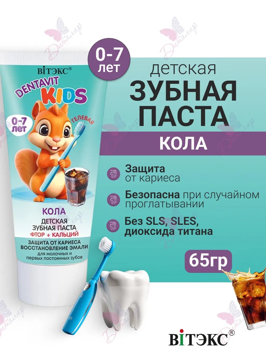 Dentavit kids детская зубная паста гелевая фтор + кальций защита от кариеса и восстановление эмали, кола; - укрепление эмали, снижение образования налета, - безопасна при случайном проглатывании. Гелевая зубная паста, разработанная с учетом особенностей детских зубов, эффективно и бережно очищает уязвимую эмаль молочных и постоянных зубов от налёта, не травмируя тонкую детскую эмаль. Растительные ферменты позволяют очистить зубы на участках, недоступных зубной щетке, предотвращают образование налета, обеспечивают длительную чистоту зубов и здоровье десен. Паста содержит ионы фтора в безопасной концентрации 500 ppm, которые обеспечивают надежную защиту от кариеса для молочных зубов и рост крепких и здоровых постоянных зубов. Активные компоненты быстро укрепляют эмаль, насыщают ее минералами и образуют защитный слой, что особенно важно, так как некоторые детки не выдерживают рекомендованное время чистки зубов. Искрящийся аромат колы превращает процедуру чистки зубов в яркое увлекательное приключение и помогает быстро приучить ребенка к гигиене и правильному уходу за зубками. Без sls, sles, диоксида титана.