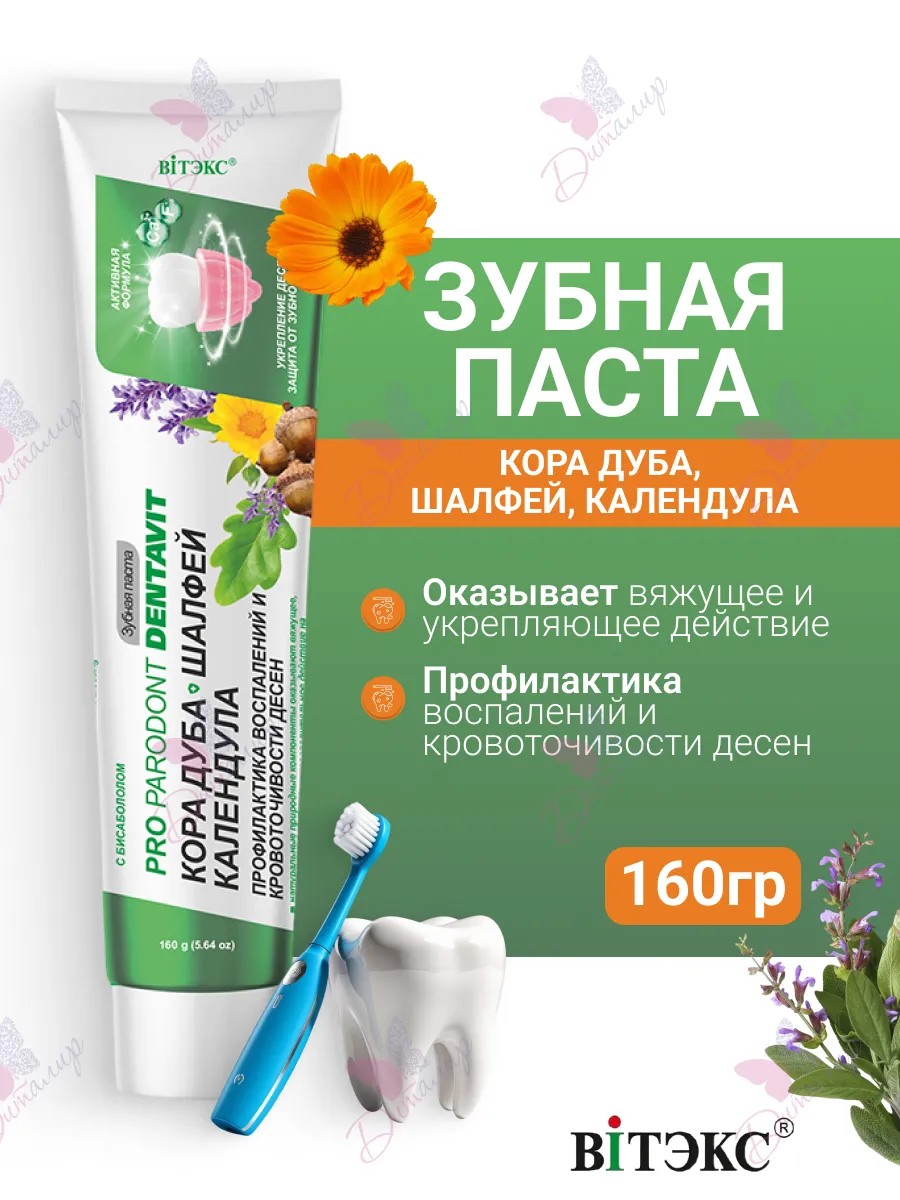 Dentavit toothpaste with oak bark, sage, and calendula prevents gum inflammation and bleeding. This toothpaste contains 100% natural extracts of oak bark, sage, and calendula, which quickly relieve inflammation, reduce gum bleeding, and have an astringent and strengthening effect. Bisabolol has an anti-inflammatory and soothing effect on the oral mucosa. Sodium pyrophosphate effectively combats tartar and the causes of its formation, preventing plaque buildup. The toothpaste contains an effective concentration of 1000 ppm fluoride ions and a special form of calcium that is easily absorbed by enamel. This quickly replenishes demineralized areas of hard tooth tissue with essential minerals, restoring the whiteness and shine of enamel, strengthening teeth, and improving their appearance. An ultra-effective complex of ingredients: - effectively strengthens gums, - reduces inflammation and bleeding, - reliably protects tooth enamel from cavities. Directions: Brush your teeth for 2-3 minutes, then rinse your mouth. Do not swallow! It is recommended to brush your teeth at least twice a day. For adults only.