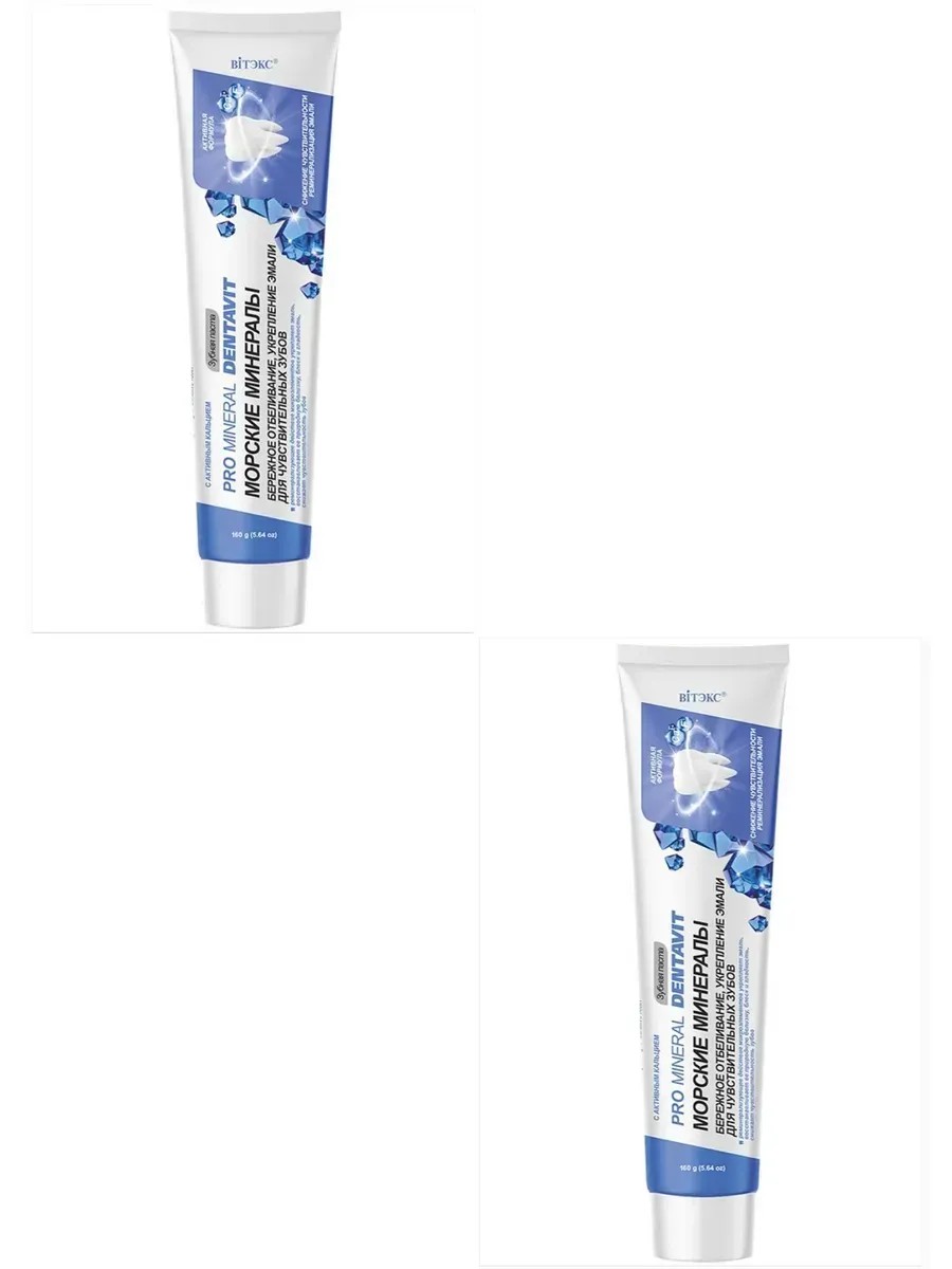 Vitex Sea Minerals Gentle Whitening Toothpaste, 160 ml, 2 pieces. This toothpaste contains a complex of sea minerals and trace elements that fill microcracks in tooth enamel, accelerate its remineralization, significantly improve its strength, and reduce tooth sensitivity. Bisabolol has an anti-inflammatory and soothing effect on the oral mucosa, accelerating regeneration processes. Calcium hydroxyapatite is a special bioavailable form of calcium that is easily absorbed by enamel. Thanks to the synergy of the active ingredients, demineralized areas of hard dental tissue are quickly filled with essential minerals, restoring the whiteness and shine of the enamel, strengthening teeth, and improving their appearance. This toothpaste contains an optimal concentration of fluoride ions (1500 ppm). An ultra-effective complex of ingredients: - restores enamel whiteness and shine - reduces tooth sensitivity - restores demineralized areas - ensures long-lasting smoothness of tooth surfaces. Directions: Brush your teeth for 2-3 minutes, then rinse your mouth. Do not swallow! It is recommended to brush your teeth at least twice a day. For adults only.