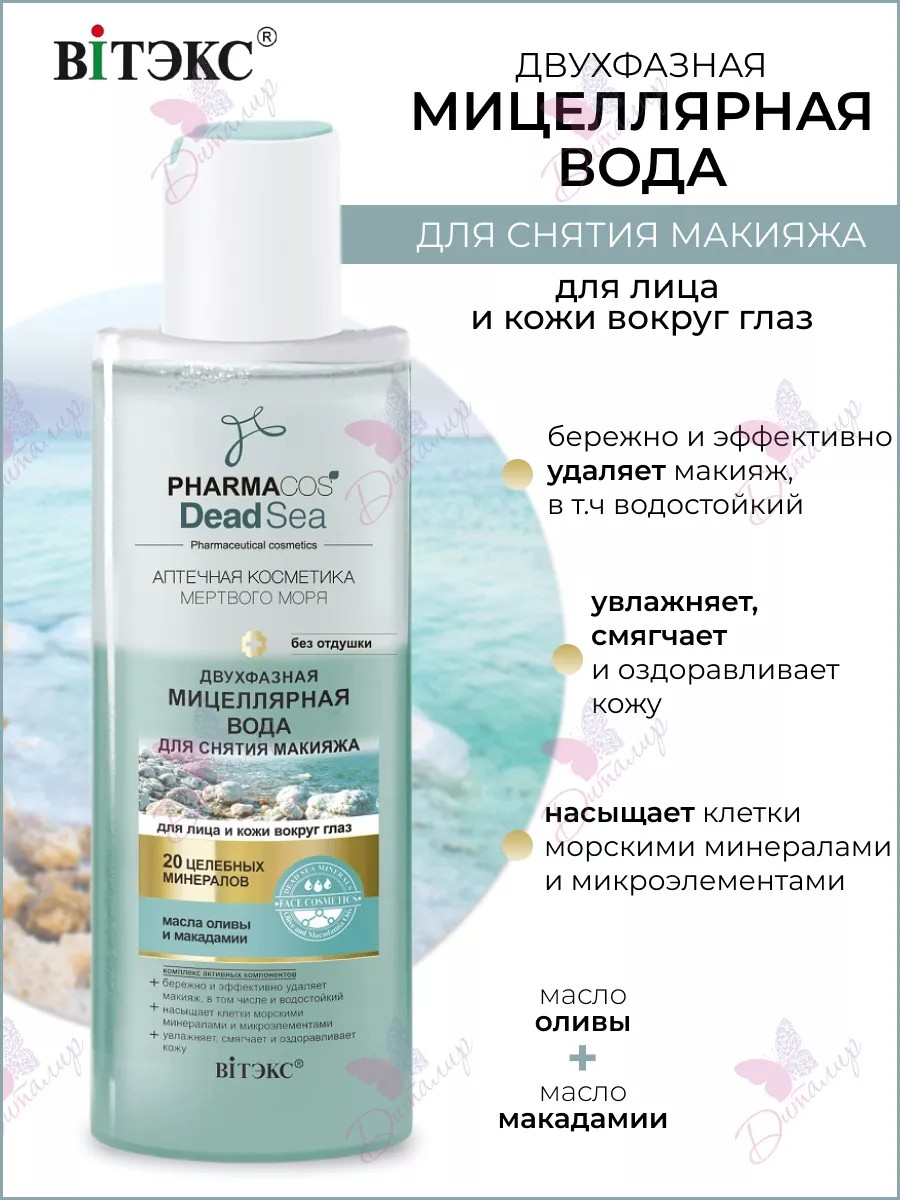 TWO-PHASE MICELLAR WATER for removing makeup from the face and eye area. 20 healing minerals from olive and macadamia oils gently and effectively remove makeup, including waterproof makeup, saturates cells with sea minerals and microelements, and moisturizes, softens, and revitalizes the skin. Specialists at the VITEX Scientific Center have created a new generation of two-phase formulas for exceptionally gentle, delicate, and highly effective cleansing and makeup removal. This two-phase micellar water with oils allows you to cleanse the skin of makeup and impurities in one stroke without unnecessary friction, without disturbing the skin's natural pH balance or protective lipid layer. The innovative formula consists of two phases: The aqueous phase contains micelles—special cleansing spheres that attract impurities from the skin and retain them within themselves. The oil phase, enriched with precious macadamia and olive oils, allows you to easily and quickly remove even waterproof makeup. Thanks to 20 healing Dead Sea minerals, the skin is revitalized, hydrated, and softened during the cleansing process. Directions: Shake vigorously to combine the two phases, apply the product to a cotton pad, and gently remove makeup from the face and eye area. No rinsing or additional washing required. Leaves no greasy shine.