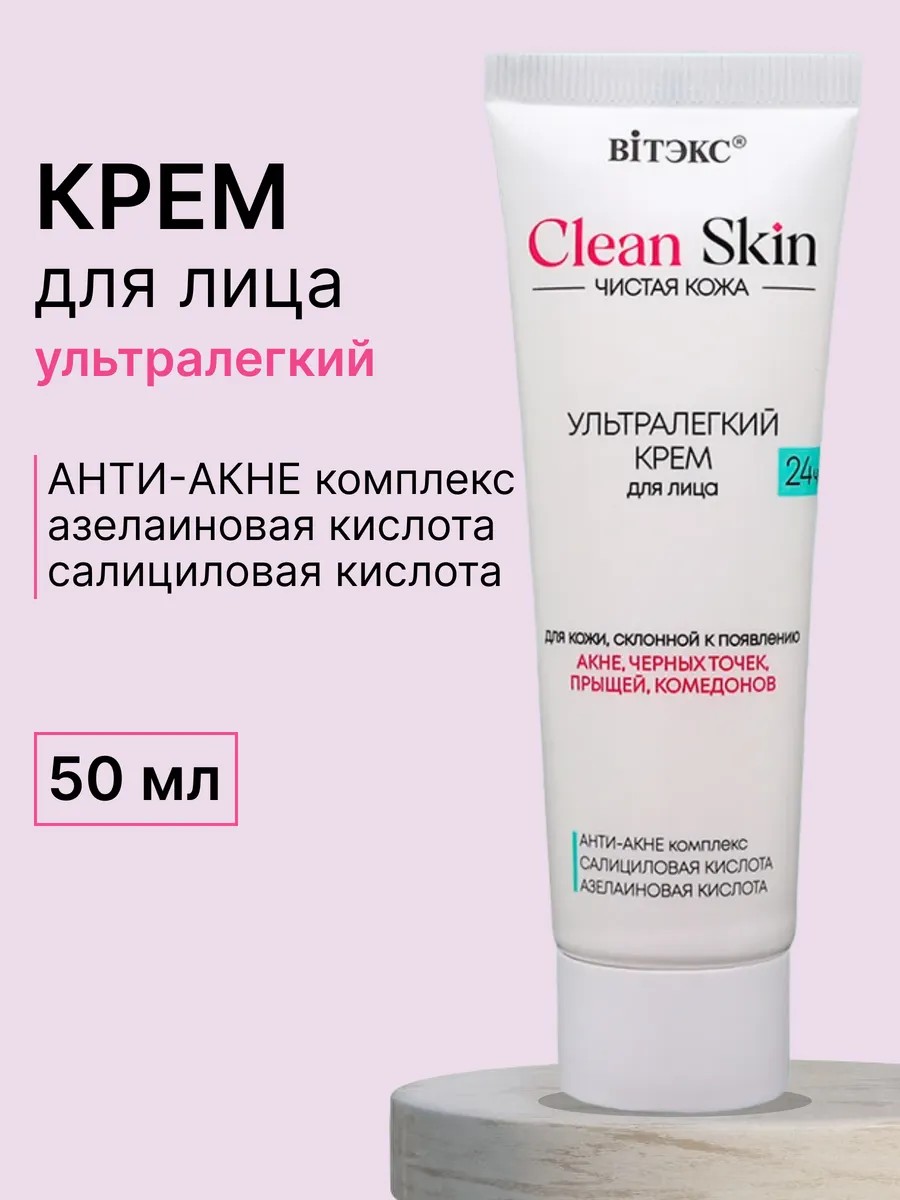 Ультралегкий крем для лица 24ч с анти-акне комплексом «CLEAN SKIN» от белорусского бренда Витекс — это идеальное решение для ухода за проблемной кожей. Уходовая косметика для лица разработана специально для борьбы с несовершенствами и подходит для чувствительной кожи. Увлажняющий крем для лица с ультралегкой воздушной текстурой сужает поры и увлажняет кожу. Крем длялица увлажняющий идеально подходит для ухода за проблемной кожей, склонной к закупорке пор и появлению прыщей, черных точек, комедонов и акне. Салициловая и азелаиновая кислоты дополняют и усиливают действие друг друга: эффективно борются с угревой сыпью, способствуют уменьшению количества прыщей, устраняют следы постакне, выравнивают цвет лица, предотвращают появление черных точек и комедонов. Мощный комплекс анти-акне и ниацинамид значительно сокращают и предупреждают повторное появление несовершенств, улучшают состояние кожи, увлажняют ее и восстанавливают, нормализуют гидролипидный баланс эпидермиса, препятствуют появлению жирного блеска. Центелла оказывает антиоксидантное и успокаивающее действие. При регулярном применении крема активные компоненты помогают избавиться от угревой сыпи, прыщей и комедонов, нормализуют себорегуляцию, делают поры практически незаметными, выравнивают тон и рельеф кожи. Белорусская косметика «CLEAN SKIN Чистая кожа» – главный этап ухода за кожей, особенно проблемной, склонной к появлению акне, черных точек, прыщей, комедонов. Крем для лица от прыщей не только борется с высыпаниями, но и ухаживает за кожей, восстанавливая ее естественный баланс. Используйте крем для лица увлажняющий отVitex ежедневно в своем уходе за лицом, чтобы достичь здорового и ухоженного вида кожи.