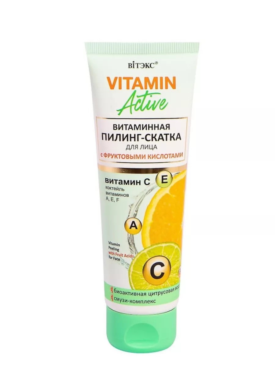 Витэкс Vitamin Active Витаминная пилинг-скатка для лица с фруктовыми кислотами, 75 мл. Очень легкая, нежирная текстура апельсинового цвета, напоминающая вкусное фруктовое желе, мягко скатывается на коже и впитывает загрязнения, очищает поры, поглощает токсины, при этом одновременно насыщает кожу необходимыми витаминами и антиоксидантами.