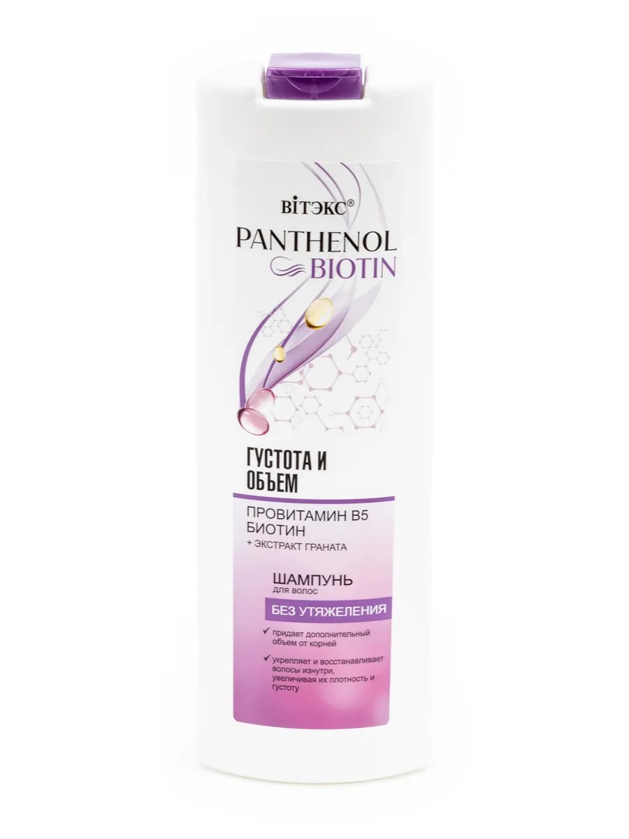 Витэкс Шампунь женский Panthenol & Biotin Густота и объем с провитамин В5 и биотином 500мл / уходовая косметика. Жидкий шампунь для волос женский Витэкс Panthenol & Biotin Густота и объем благодаря входящим в состав натуральным ингредиентам заботится о волосах, укрепляет и питает их, придает волосам ухоженный, здоровый вид. Его цель: восстановить естественный объем, вернуть гладкость и сияние. Провитамин В5 увлажняет и восстанавливает волосы, придает им дополнительную густоту и плотность, облегчает укладку, дарит волосам глянцевый блеск и роскошный объем. Биотин улучшает состояние кожи головы, способствует увеличению количества, объема и толщины волос, уменьшает выпадение. Результат питательного шампуня Витэкс Panthenol & Biotin Густота и объем: блестящие, плотные, здоровые волосы с невероятным запахом! Для волос шампунь женский / шампунь женский для волос / женский шампунь для волос Состав: вода, цетеариловый спирт, хлорид цетримония, кватерниум-87, пантенол, экстракт Punica Granatum (граната), биотин, парфюмерная композиция, силикон кватерниум-18, тридецет-6, тридецет-12, ЭДТА динатрия, бензиловый спирт, метилхлоризотиазолинон, метилизотиазолинон, метилпарабен, лимонная кислота, пропилпарабен, линалол, гексилциннамаль.