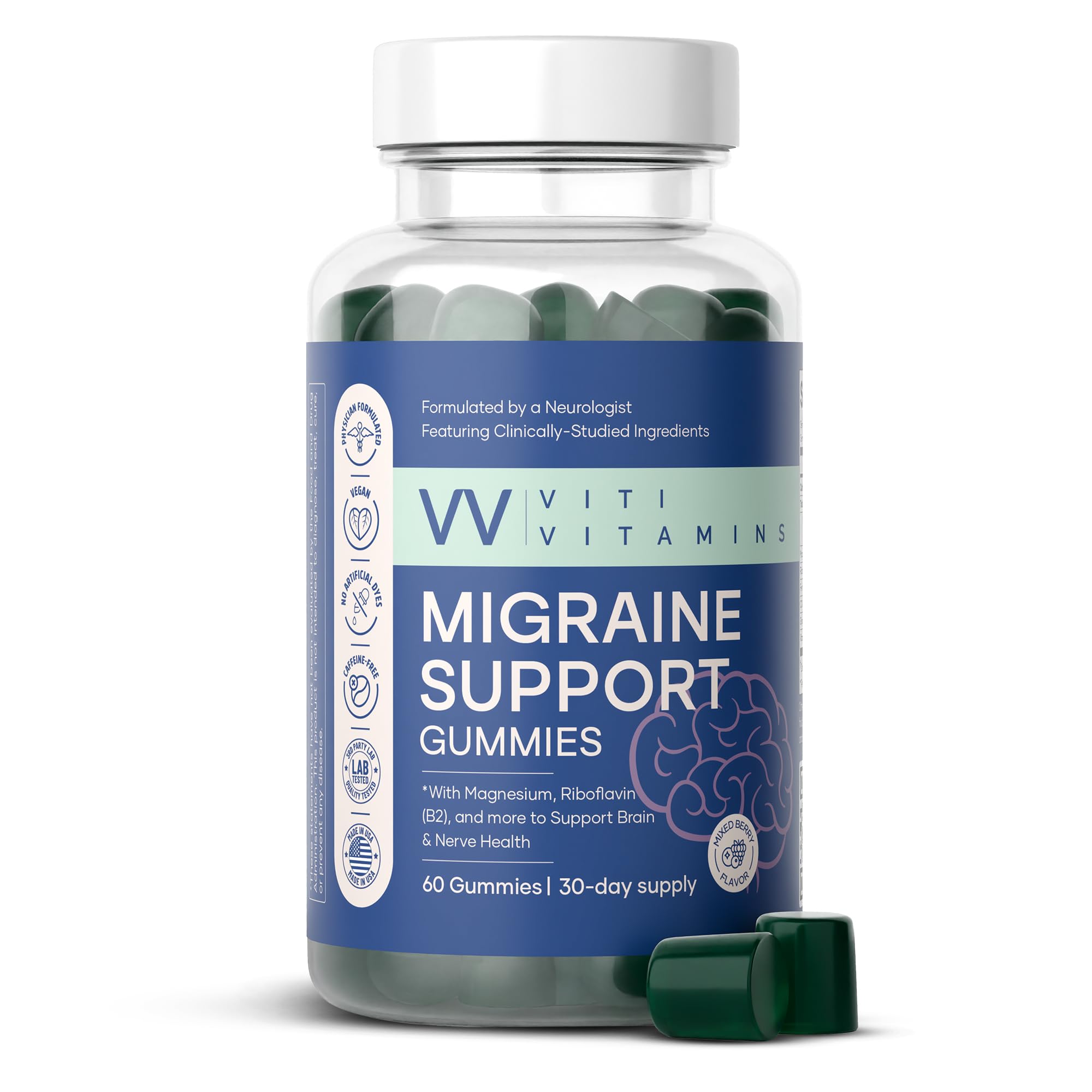 ? Real Relief, Real Results Many migraine sufferers have switched to Viti Vitamins for a reason: it works. Whether you're dealing with hormonal triggers, stress, or lifestyle-related headaches, our gummies help you reclaim your focus, your energy, and your life. Made for Consistent, Preventive Use Take 2 gummies daily to support brain chemistry, energy production, and head comfort over time. Best results come with consistent use. Gentle, Delicious Easy to Take Naturally flavored gummies that are vegan, non-GMO, gluten-free, caffeine-free, and preservative-free. Made in an FDA-registered, cGMP-certified facility in the USA. ? Neurologist-Formulated Science-Backed Created by a board-trained neurologist using ingredients that have been widely studied for migraine prevention and neurological support. Complete 6-in-1 Clinically Studied Formula Each serving delivers Magnesium Glycinate (400 mg), Riboflavin B2 (400 mg), CoQ10 (100 mg), Feverfew (100 mg), Ginger (100 mg), and Vitamin B6 (20 mg). An all-in-one delicious gummy, no pills required. Daily Migraine Headache Support VitiVitamins Migraine Support Gummies are designed to help reduce migraine frequency and support long-term neurological balance. This daily gummy targets common migraine drivers like nerve overactivity, inflammation, and energy imbalance.