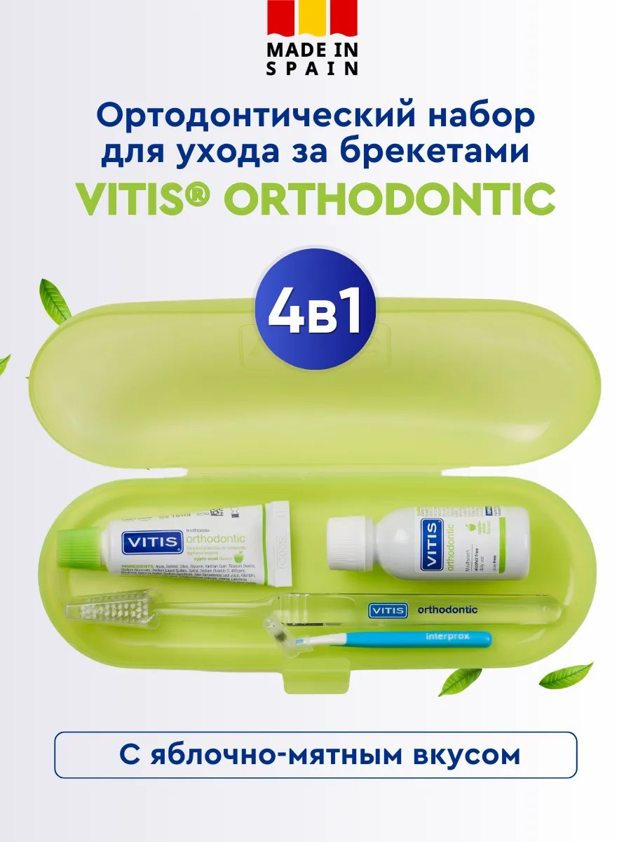 | Package contents | Vitis Orthodontic mouth rinse (30 ml) - 1 pc; Vitis Orthodontic toothpaste (15 ml) - 1 pc; Vitis Orthodontic Access toothbrush - 1 pc; Interprox Plus Conical interdental brush - 1 pc |