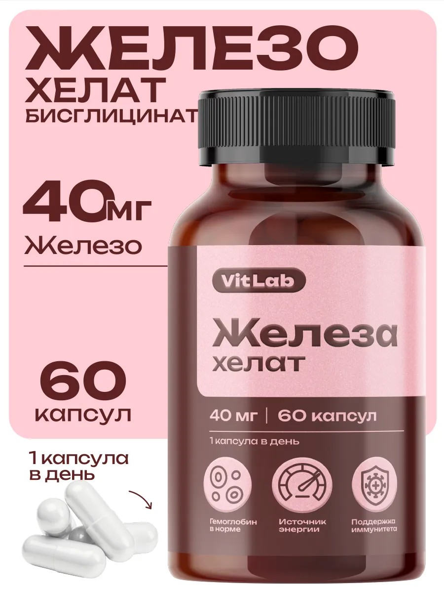 Хелат железа бисглицинат от VitLab с фолиевой кислотой и витаминами группы B — поддержка энергии, крови и женского здоровья