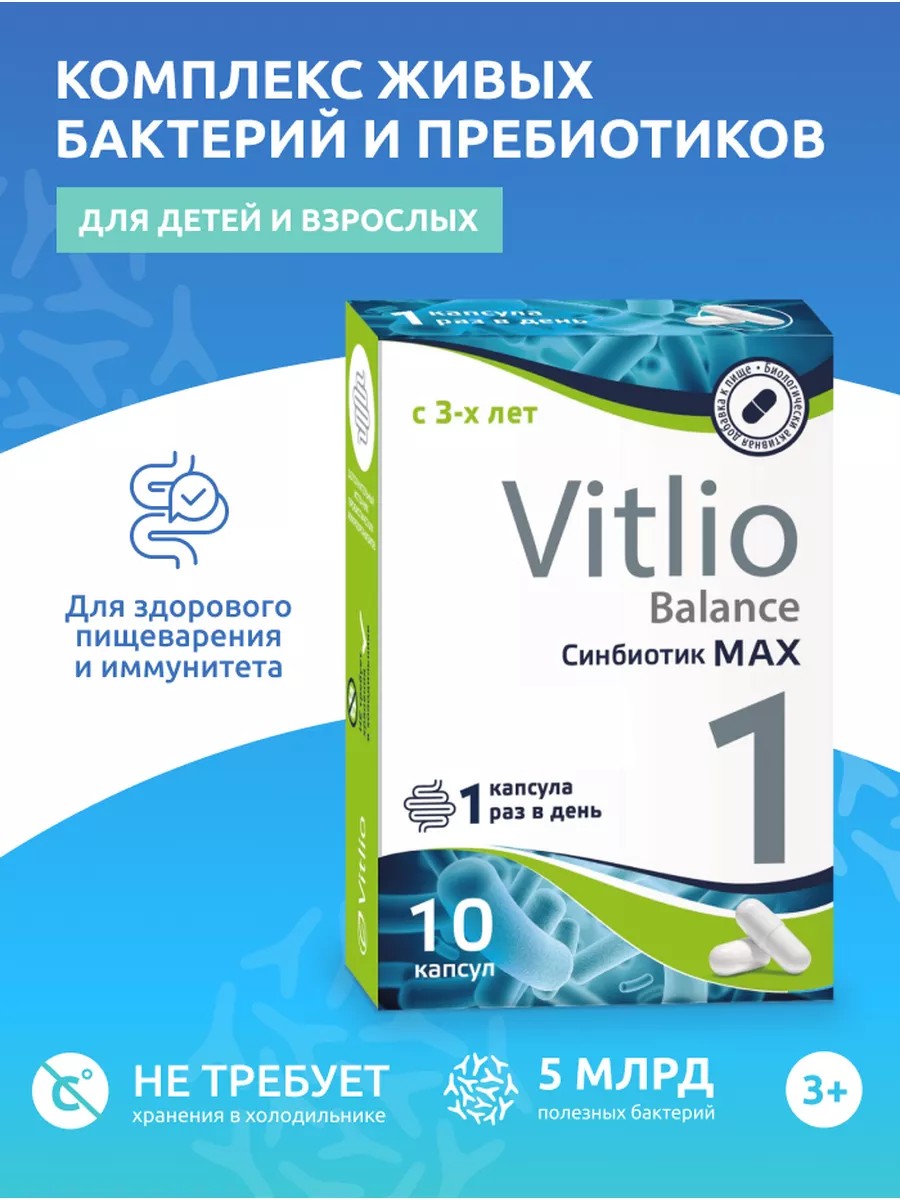 Synbiotic Max is a dietary supplement with the combined properties of probiotics and prebiotics. This combined action allows for replacement therapy and creates an optimal environment for the growth and development of beneficial microorganisms. It is a source of probiotic microorganisms (bifidobacteria, lactobacilli) and lactic acid bacteria (streptococcus thermophilus). Thanks to the innovative protective coating of the BIFI GUARD capsule, the bacteria are not affected by the acidic contents of gastric juice, salts, bile, and digestive enzymes. Contains an optimal balance of 12 species of lacto- and bifidobacteria. It does not require refrigeration and is easy to take with you on trips or to work. It helps relieve discomfort after long-term antibiotic therapy.