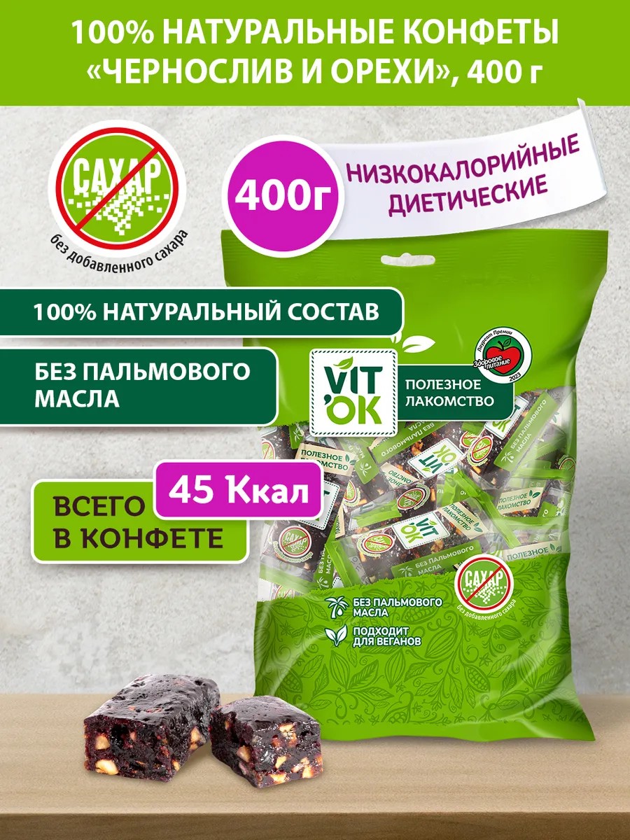 Конфеты VITok это полезные сладости. Это идеальный десерт для правильного здорового питания: умеренно сладкий, с легкой сливовой кислинкой и приятными ореховыми нотками.