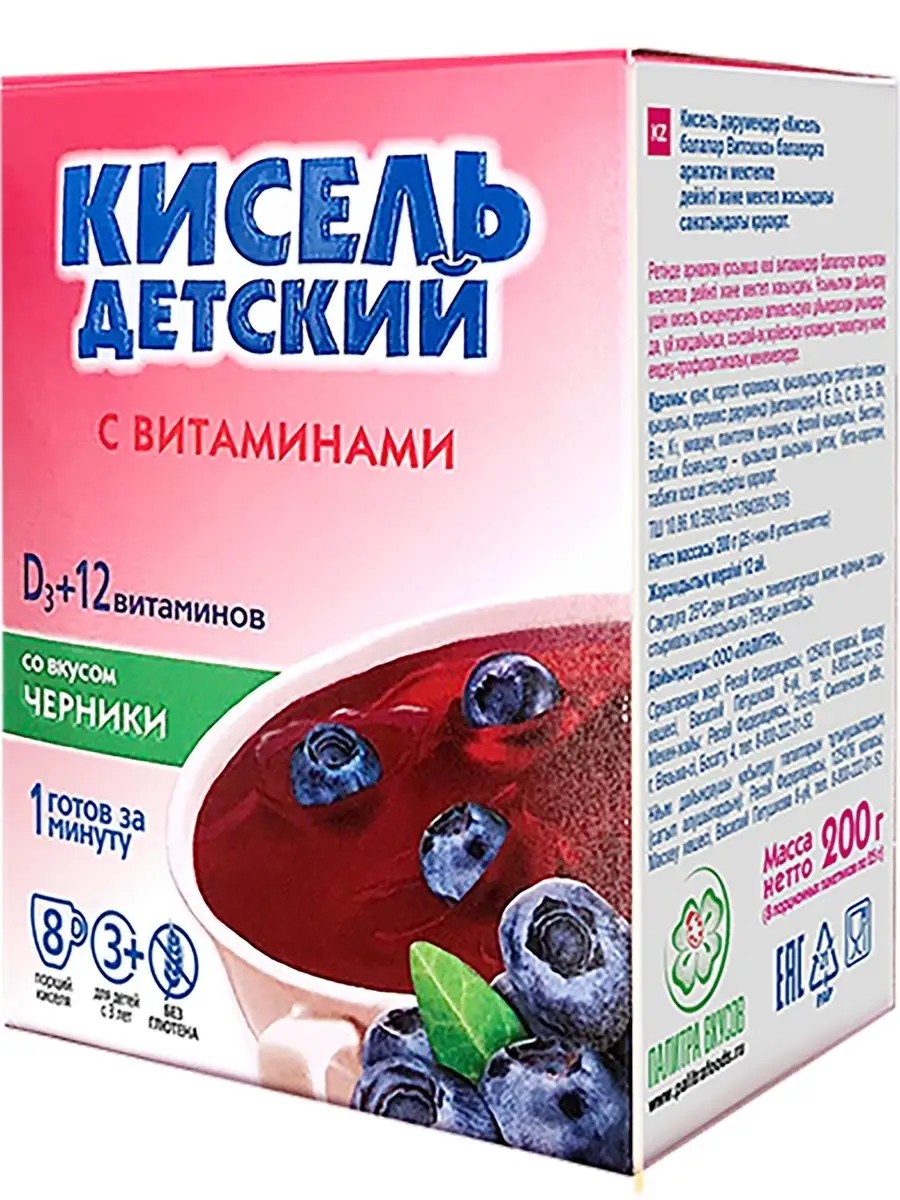 VITOSHKA Kissel with 13 quick-cooking vitamins, 100% natural ingredients. Blueberry flavor. With natural colors - beetroot juice powder, beta-crotin, and natural Blueberry flavor. Kissel is recommended as an additional source of vitamins to boost immunity, replenish vitamin deficiencies, improve health, and enhance the physical and mental development of children and adults. It is especially necessary for frequently ill and weakened children, and for the prevention of colds and flu. The components of this healthy jelly have an enveloping effect. In the production of this product: forms of vitamins that are STABLE UNDER HEAT PROCESSING are used. Contains no preservatives, stabilizers, artificial colors or GMOs, gluten-free. Directions: Pour the contents of the sachet into a cup. Add 180 ml of BOILING water, stirring vigorously. Stir thoroughly until a homogeneous product is obtained. Serve warm or chilled. Package of 8 pcs. 25 g each. For children, adults, and children after gastrointestinal illness. INGREDIENTS: 13 vitamins A, E, D3, C, B1, B2, B6, B12, PP, K1, B5, B9, B7, sugar, potato starch, citric acid acidity regulator, natural beetroot juice coloring, beta-carotene, natural flavoring.