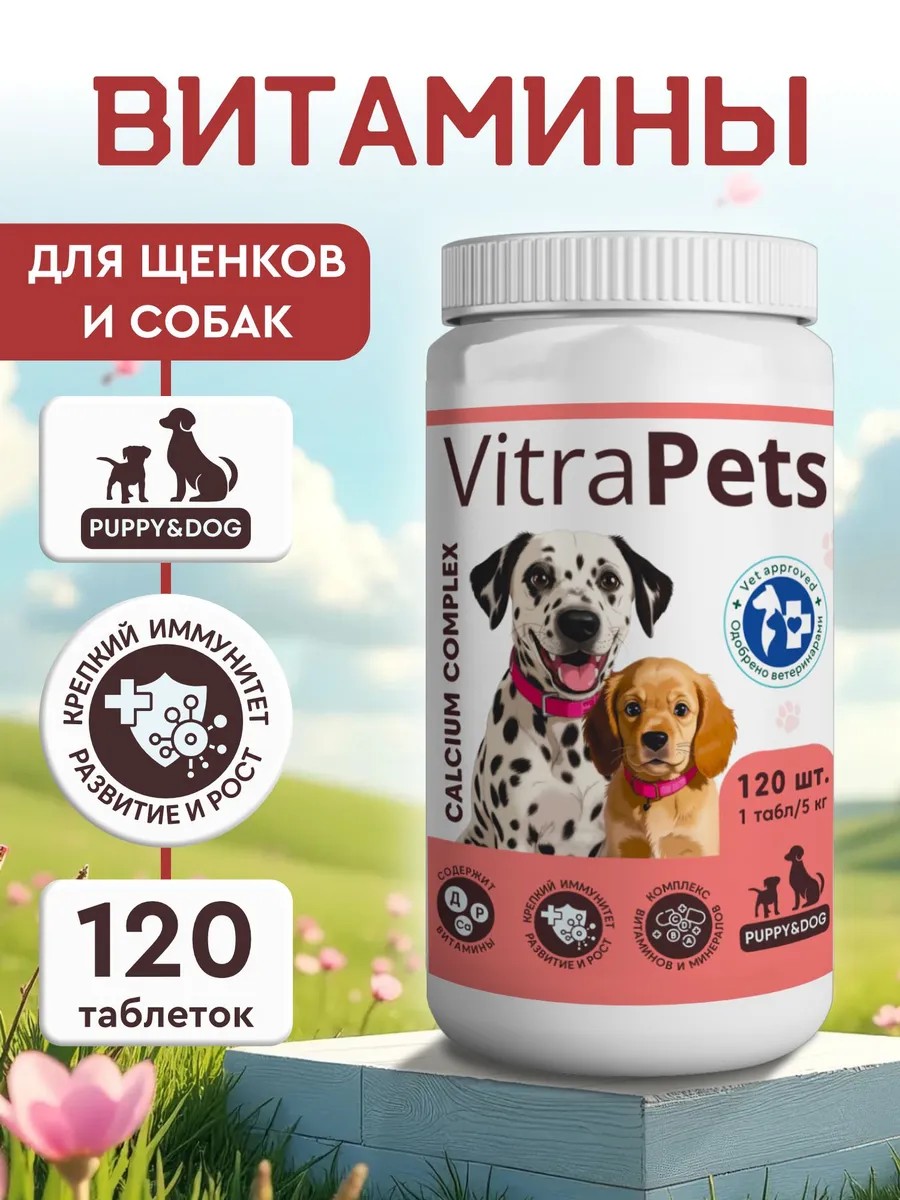 | Полное наименование товара | VitraPets Calcium Complex Puppy&Dog Кормовая добавка для щенков и взрослых собак, комплекс кальций, фосфор и витамин Д, мультивитаминный комплекс, 120 таб |