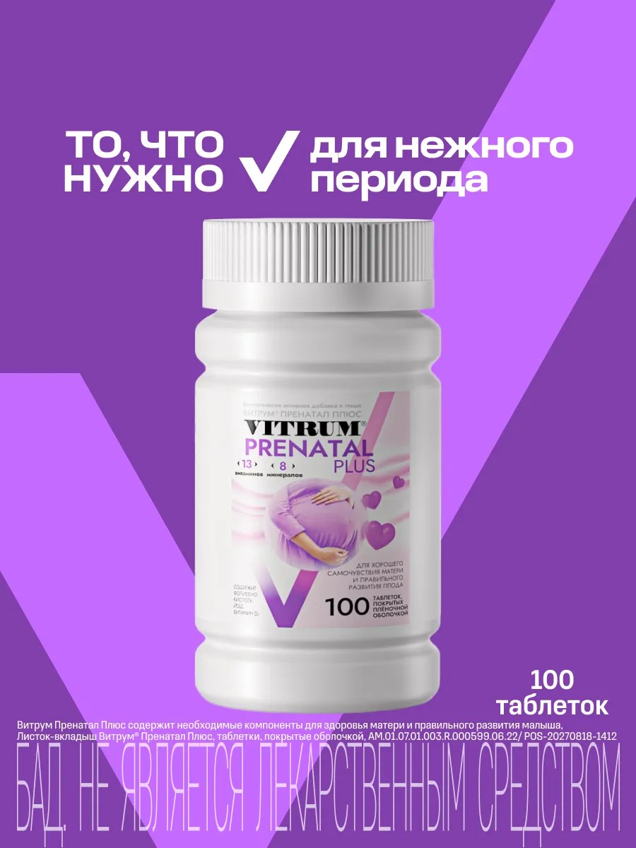 | Trade name | Dietary supplement "Vitrum Prenatal Plus". Release form: film-coated tablets weighing 1470 mg. |