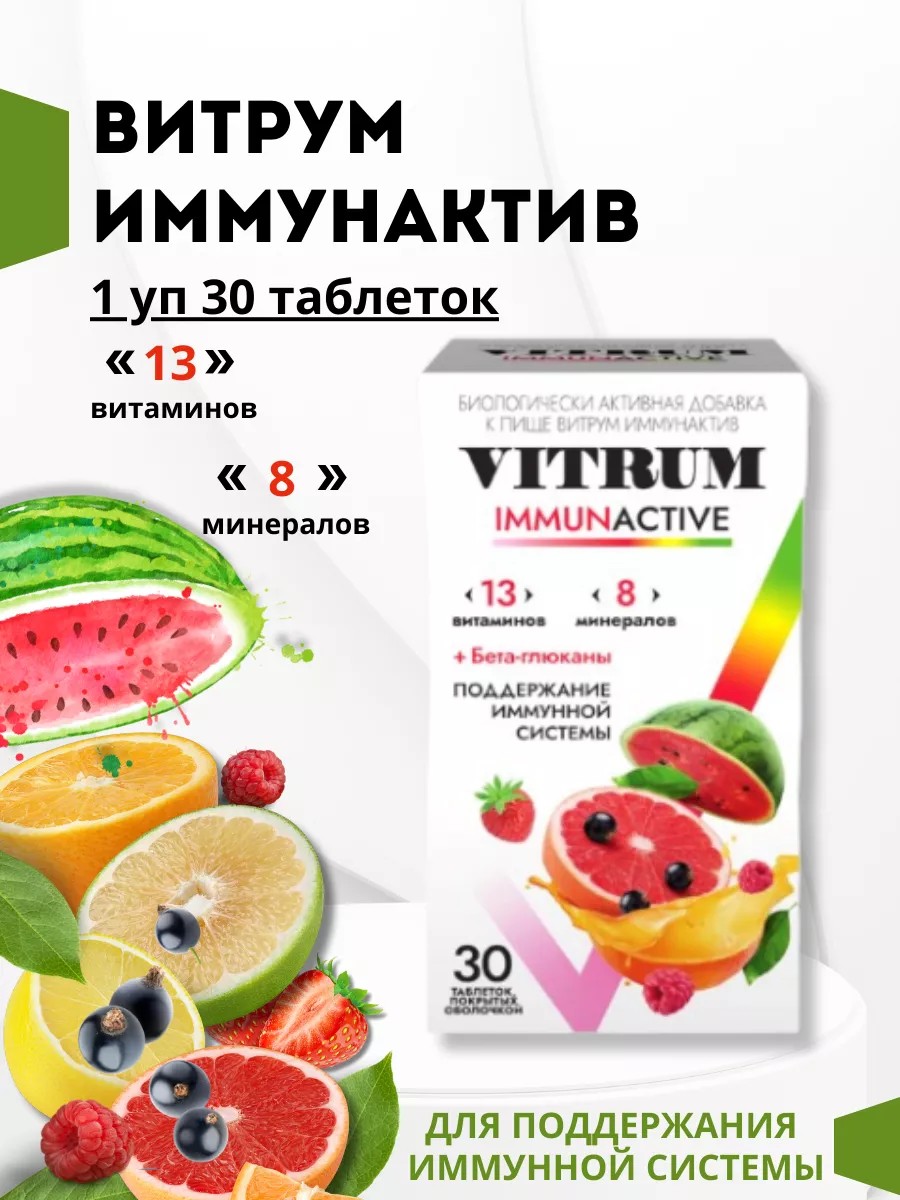 Витаминно-минеральный комплекс ВИТРУМ ИММУНАКТИВ VITRUM IMMUNACTIVE содержит 13 витаминов и 8 минералов, а также бета-глюканы и биофлаваноидный комплекс - необходимые компоненты, которые синергично работают для поддержки иммунитета:- Витамины А, С, Е способствуют улучшению барьерной функции слизистых оболочек, способствуют продукции иммуноглобулина А, интерферона, в слизистых оболочках дыхательного тракта, участвуют в антиоксидантной защите организма, что приводит к уменьшению прикрепления и дальнейшего проникновения бактерий и вирусов.- Витамины В6, В12, С, D, Е и фолиевая кислота наряду с микроэлементами (железо, цинк, медь и селен) действуют синергично в поддержке функционирования иммунных клеток. Недостаточное потребление этих витаминов и микроэлементов может приводить к подавлению иммунитета- Селен и цинк - природные элементы антиоксидантной системы защиты организма человека. Цинк участвует в дифференциации лимфоцитов, особенно Т-звена, ускоряя появление иммунного ответа на инфекцию в организме. Среди иммуномодулирующих эффектов цинка, которые имеют прямое отношение к защите от вирусной инфекции, является стимуляция производства интерферона-альфа и интерферона-гамма. Селен регулирует производство иммуноглобулина G, повышает активность лимфоцитов.- Бета-глюканы природные вещества (полисахариды), которые содержатся в водорослях, злаковых, растениях, грибах, бактериях, дрожжах. Бета-глюканы активизируют клетки иммунной системы, способствуют защите от влияния патогенных микроорганизмов.- Биофлавоноиды (их собирательно называют витамином Р) - растительные соединения, которые содержатся в плодах, цветах и стеблях различных растений, особенно цитрусовых и розоцветных. Биофлавоноиды - сильные природные антиоксиданты, они способствуют лучшему усвоению витамина C, улучшают состояние сосудистой системы, укрепляют стенки капилляров.