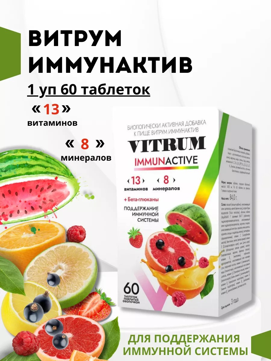 Витаминно-минеральный комплекс ВИТРУМ ИММУНАКТИВ VITRUM IMMUNACTIVE содержит 13 витаминов и 8 минералов, а также бета-глюканы и биофлаваноидный комплекс - необходимые компоненты, которые синергично работают для поддержки иммунитета:- Витамины А, С, Е способствуют улучшению барьерной функции слизистых оболочек, способствуют продукции иммуноглобулина А, интерферона, в слизистых оболочках дыхательного тракта, участвуют в антиоксидантной защите организма, что приводит к уменьшению прикрепления и дальнейшего проникновения бактерий и вирусов.- Витамины В6, В12, С, D, Е и фолиевая кислота наряду с микроэлементами (железо, цинк, медь и селен) действуют синергично в поддержке функционирования иммунных клеток. Недостаточное потребление этих витаминов и микроэлементов может приводить к подавлению иммунитета- Селен и цинк - природные элементы антиоксидантной системы защиты организма человека. Цинк участвует в дифференциации лимфоцитов, особенно Т-звена, ускоряя появление иммунного ответа на инфекцию в организме. Среди иммуномодулирующих эффектов цинка, которые имеют прямое отношение к защите от вирусной инфекции, является стимуляция производства интерферона-альфа и интерферона-гамма. Селен регулирует производство иммуноглобулина G, повышает активность лимфоцитов.- Бета-глюканы природные вещества (полисахариды), которые содержатся в водорослях, злаковых, растениях, грибах, бактериях, дрожжах. Бета-глюканы активизируют клетки иммунной системы, способствуют защите от влияния патогенных микроорганизмов.- Биофлавоноиды (их собирательно называют витамином Р) - растительные соединения, которые содержатся в плодах, цветах и стеблях различных растений, особенно цитрусовых и розоцветных. Биофлавоноиды - сильные природные антиоксиданты, они способствуют лучшему усвоению витамина C, улучшают состояние сосудистой системы, укрепляют стенки капилляров.