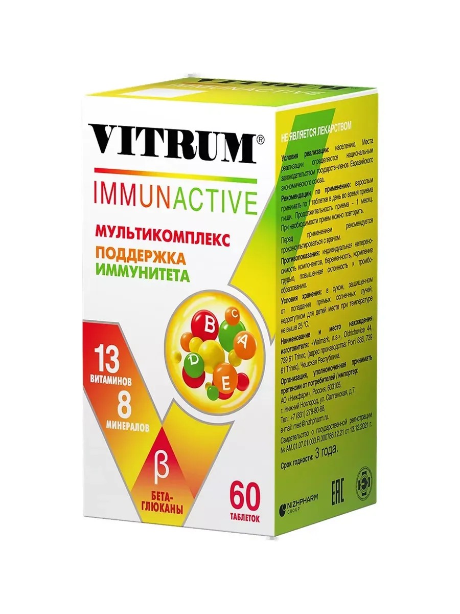 Витрум Иммунактив - это биологически активная добавка (БАД) к пище, которая способствует поддержанию иммунной системы. Препарат содержит комплекс витаминов и минералов, необходимых для крепкого здоровья организма. Витрум Иммунактив рекомендуется для профилактики простудных заболеваний, а также для повышения иммунитета в период восстановления после болезней. Препарат прост в применении и имеет удобную форму выпуска - таблетки, покрытые оболочкой.