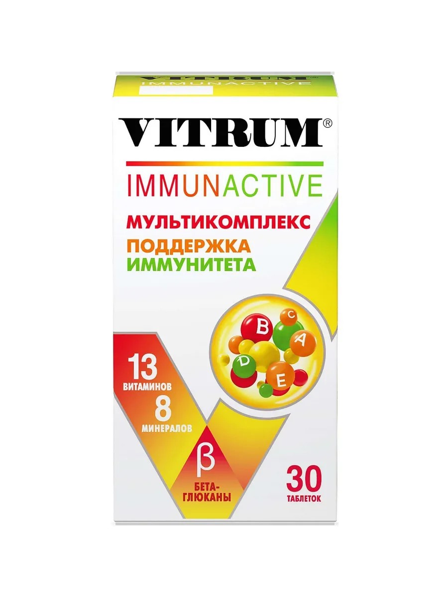 Витаминно-минеральный комплекс ВИТРУМ ИММУНАКТИВ VITRUM IMMUNACTIVE содержит 13 витаминов и 8 минералов, а также бета-глюканы и биофлаваноидный комплекс - необходимые компоненты, которые синергично работают для поддержки иммунитета: - Витамины А, С, Е способствуют улучшению барьерной функции слизистых оболочек, способствуют продукции иммуноглобулина А, интерферона, в слизистых оболочках дыхательного тракта, участвуют в антиоксидантной защите организма, что приводит к уменьшению прикрепления и дальнейшего проникновения бактерий и вирусов. - Витамины В6, В12, С, D, Е и фолиевая кислота наряду с микроэлементами (железо, цинк, медь и селен) действуют синергично в поддержке функционирования иммунных клеток. Недостаточное потребление этих витаминов и микроэлементов может приводить к подавлению иммунитета.
