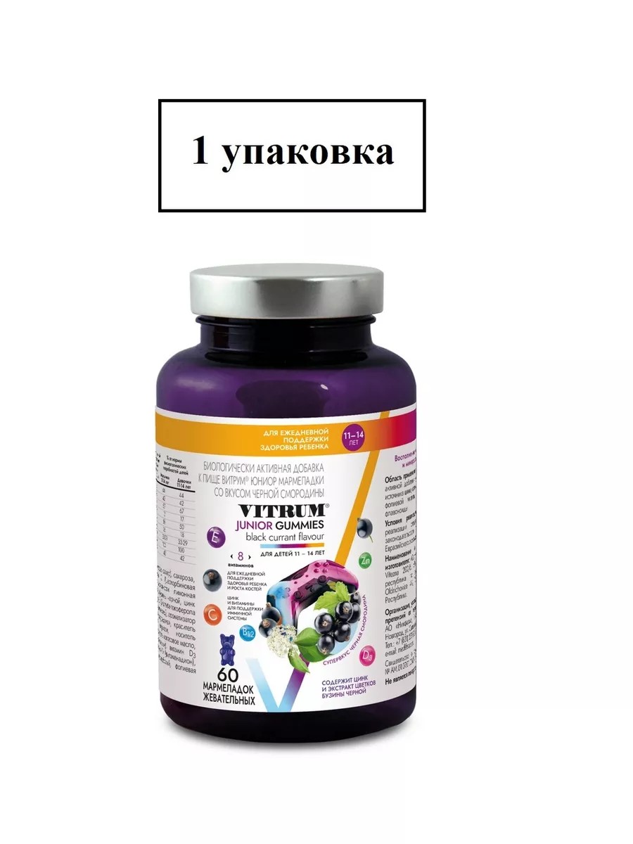 Витаминно-минеральный комплекс Витрум Юниор мармеладки со вкусом черной смородины - для детей 11 -14 лет, для поддержки роста и развития ребенка. Содержат сбалансированный набор витаминов и минералов: 8 витаминов, цинк и природный иммуномодулятор - экстракт цветков бузины черной, для укрепления иммунитета в период вирусных заболеваний.