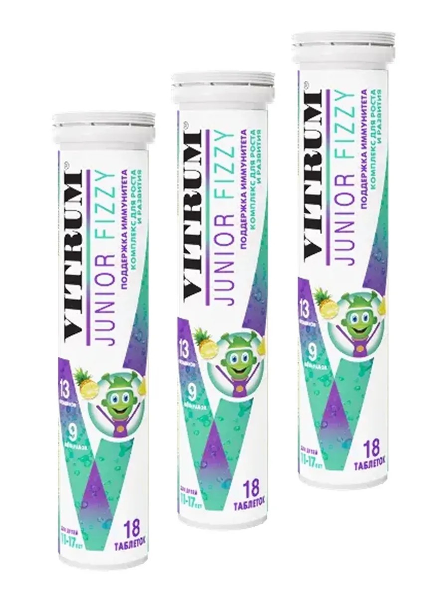 Витрум юниор шипучий - это мультивитаминная биологически активная добавка к пище, разработанная специально для детей в возрасте от 11 до 17 лет. Препарат содержит необходимые организму подростка витамины и минералы в оптимальной пропорции, которые способствуют здоровому росту и развитию организма, корректировке нервной возбудимости, улучшению памяти и внимания.. Шипучие таблетки имеют приятный вкус.Перед применением рекомендуется проконсультироваться с врачом.