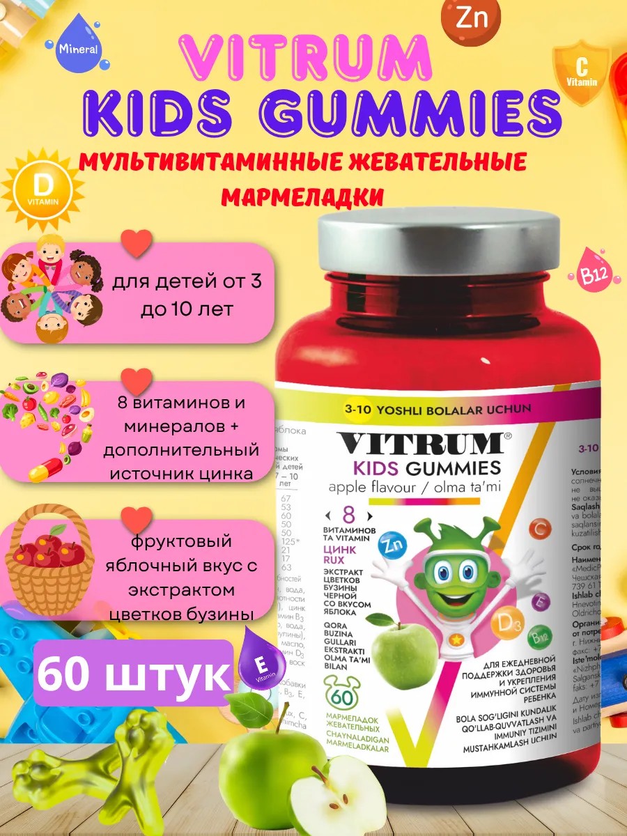| Full name of product | Dietary supplement Vitrum Kids Apple-flavored gummies 3.5 g No. 60 MedicProgress a.s. - Czech Republic |