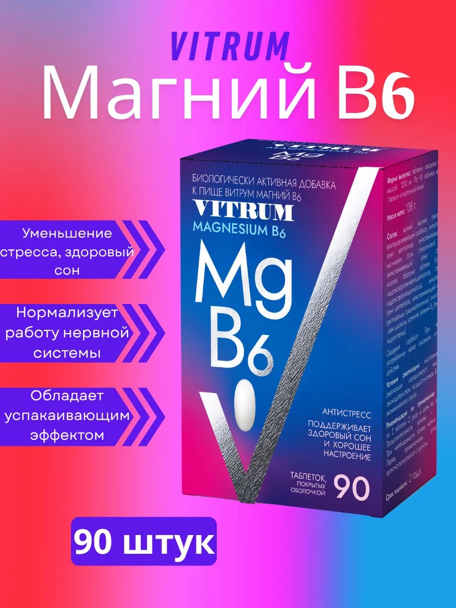 | Комплектация | По 90 таблеток во флаконе, 1 флакон в картонной пачке; витамины; бады; для нервной системы витамины; Витамины магний; витамин В6; в6 витамин магний; витамин в6 в таблетках; Магний В6; витамины для нервной системы в6; витамин б6 в таблетках; витрум витамины |