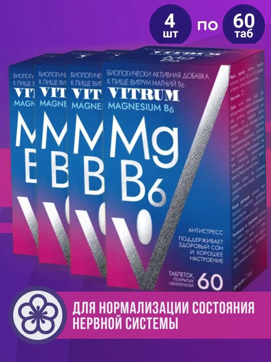 | Торговое наименование | биологически активная добавка к пище "ВИТРУМ Магний В6 (VITRUM Magnesium B6)" (таблетки, покрытые оболочкой массой 1200 мг) |
