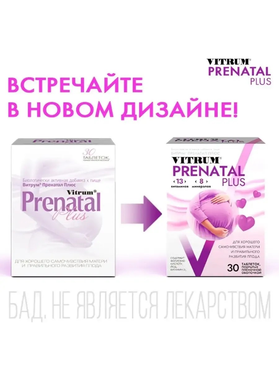 Беременность - это период огромных нагрузок на организм, в этот период особенно важно поддерживать правильный баланс витаминов и минералов, и в этом поможет специальная формула Витрум Пренатал Плюс. Витрум Пренатал Плюс содержит полный набор витаминов и минералов для беременных и кормящих женщин, все дозировки соответствуют утверждённым нормам. Йод, фолиевая кислота и витамины группы B способствуют гармоничному развитию плода, а здоровье матери поддержат витамины, А, С, D3, Е и другие важнейшие микроэлементы.