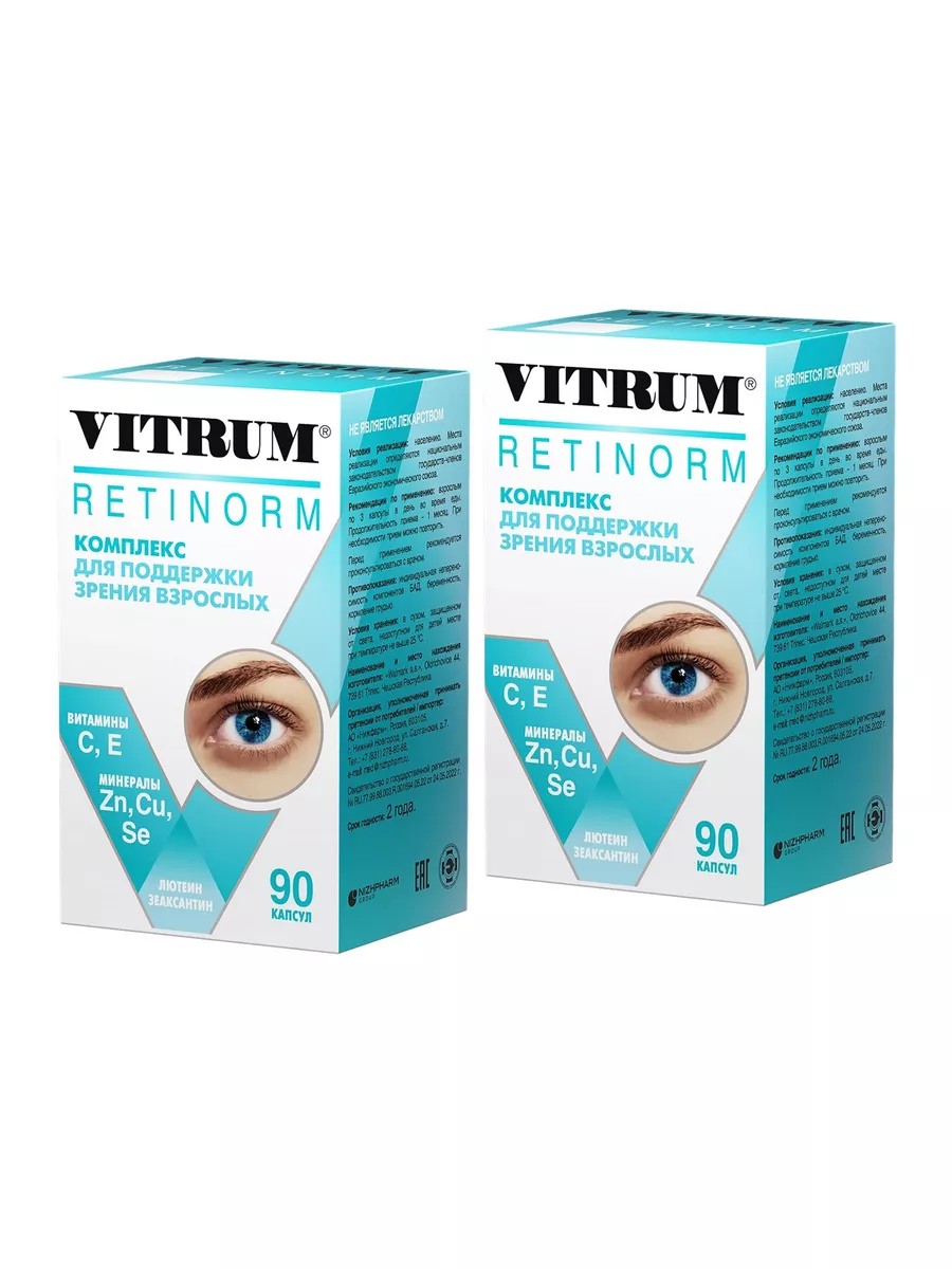 Витрум Ретинорм - это биологически активная добавка (БАД) к пище - комплекс, предназначенный для поддержки зрительной функции и здоровья глаз. Капсулы содержат в своем составе лютеин, зеаксантин, витамины С, Е, микроэлементы: медь, цинк, селен и другие полезные элементы, необходимые для нормализации обменных процессов в тканях глаза и могут способствовать снижению риска развития возрастных изменений глаз. Применение препарата способствует улучшению питания глаз; улучшению функционального состояния и нормализации обменных процессов в тканях глаза, которые могут нарушаться при: зрительном утомлении (работа за компьютером, чтение, вождение автомобиля, деятельности в условиях сниженной освещенности); воздействии повышенного ультрафиолетового излучения (в летнее время, в условиях высокогорья, профессиональные факторы риска и др.); ношении контактных линз и очков; возрастных изменений в сетчатке. Витрум Ретинорм выпускается в форме капсул, принимается взрослыми по 3 капсулы в день во время еды. Продолжительность приема 1 месяц. При необходимости прием можно повторить.