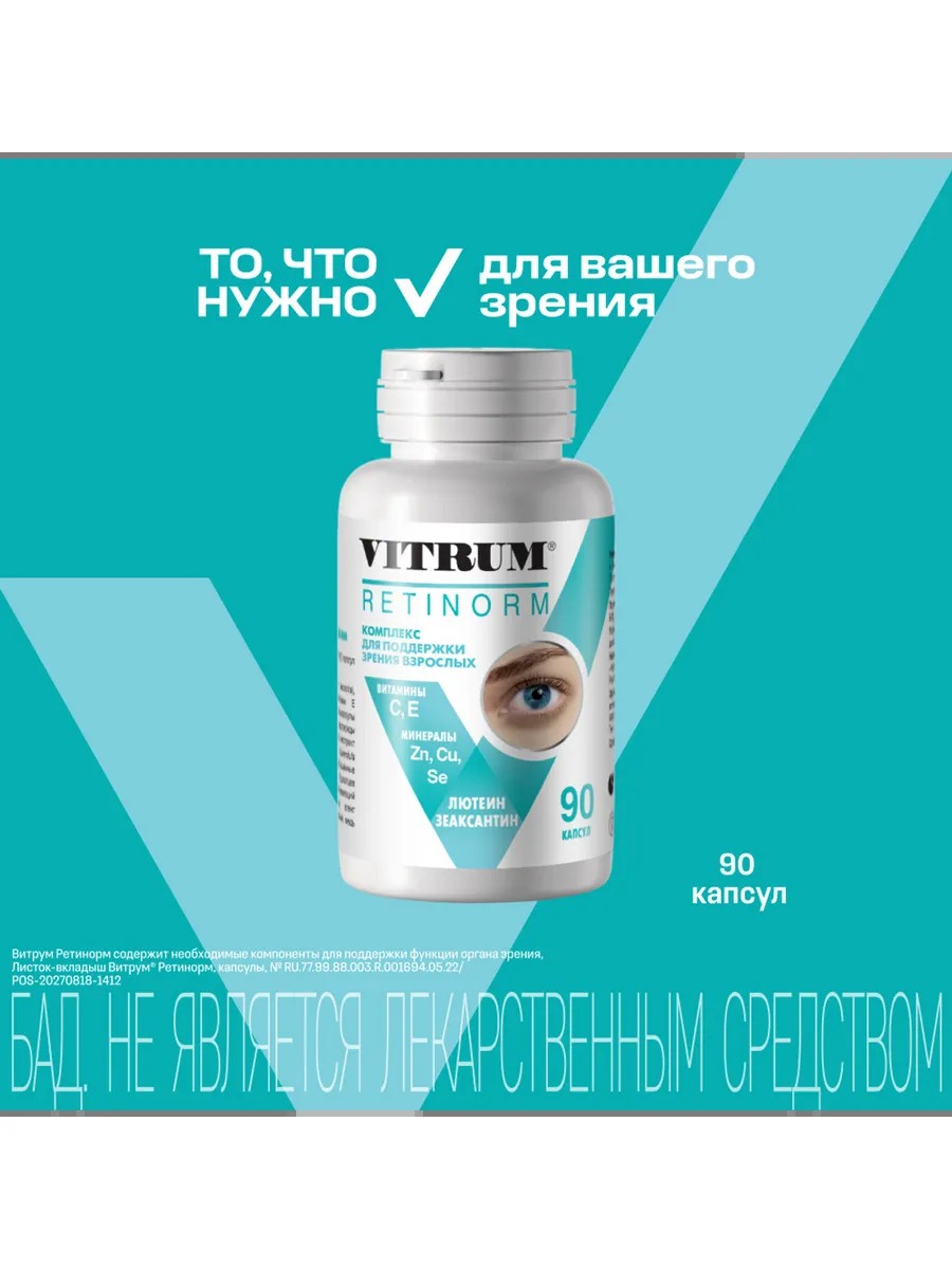 ВИТРУМ РЕТИНОРМ (VITRUM RETINORM) - Биологически активная добавка (БАД) к пище - входящие в состав БАД лютеин, зеаксантин, витамины С, Е и микроэлементы способствуют нормализации обменных процессов в тканях глаза, могут способствовать снижению риска развития возрастных изменений глаз.Компоненты биологически активной добавки к пище «ВИТРУМ РЕТИНОРМ» не синтезируются в организме человека, поэтому должны поступать извне с пищей или в составе биологически активных добавок к пище.ЛЮТЕИН И ЗЕАКСАНТИННаше зрение напрямую зависит от степени плотности макулы (желтого пятна) центральной части сетчатки. Растительные каротиноиды (лютеин и зеаксантин) накапливаются в желтом пятне, снижают вредное воздействие ультрафиолетовой части света. Они действуют как сильные антиоксиданты, блокируя действие свободных радикалов, которые повреждают ткани глаза и способствуют снижению зрения.ВИТАМИНЫ С И ЕЯвляются распространенными антиоксидантами, которые дополняют действие друг друга, защищая ткани глаза от повреждения. Способствуют восстановлению зрительных пигментов (родопсин и др.) палочек и колбочек, отвечающих за нормальное свето- и цветовосприятие. Способствуют укреплению стенок и повышению эластичности кровеносных сосудов.ЦИНК, МЕДЬ, СЕЛЕННеобходимые микроэлементы для поддержания функции зрения. Способствуют улучшению питания глаз. Недостаточное потребление данных микроэлементов может привести к ухудшению зрения.Компоненты, входящие в состав ВИТРУМ РЕТИНОРМ: лютеин, зеаксантин, витамины С, Е и микроэлементы способствуют улучшению функционального состояния и нормализации обменных процессов в тканях глаза, которые могут нарушаться при:-зрительном утомлении (работа за компьютером, чтение, вождение автомобиля, деятельност в условиях сниженной освещенности)-воздействии повышенного ультрафиолетового излучения (в летнее время, в условиях высокогорья, профессиональные факторы риска и др.)-ношении контактных линз и очков-возрастных изменений в сетчаткеПоказанияв качестве биологически активной добавки к пище дополнительного источника витаминов Е и С, микроэлементов: меди, цинка, селена, источника зеаксантина и лютеина.Противопоказанияиндивидуальная непереносимость компонентов, беременность, кормление грудью.Способ примененияВ качестве биологически активной добавки к пище дополнительного источника витаминов Е и С, микроэлементов: меди, цинка, селена, источника зеаксантина и лютеина.номер партии и срок годности на самой баночке напечатаны слева от надписи.