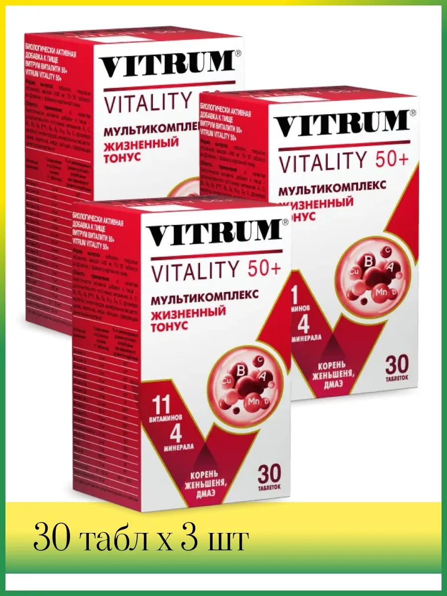 Биологически активная добавка к пище ВИТРУМ ВИТАЛИТИ 50+ VITRUM VITALITY 50+ − это витаминно‑минеральный комплекс, компоненты которого способствуют поддержанию жизненного тонуса, хорошего настроения и когнитивных функций, а также обладают антиоксидантными свойствами. Экстракт женьшеня в качестве общеукрепляющего средства способствует: повышению физической выносливости (оказывает адаптогенное действие)концентрации внимания и памяти (стимулирует функции головного мозга) поддержанию эректильной функции. Диметиламиноэтанол (ДМАЭ) − является аналогом витамина группы В (холина) и способствует:поддержанию упругости кожиподдержанию памятиулучшению настроения и сна. Витамин С − необходим для образования коллагена и соединительной ткани кожи, связок и костей и имеет важное значение для заживления ран. Согласно современным данным, употребление максимальной суточной дозы витамина С улучшает выработку коллагеновых волокон.Аскорбиновая кислота способствует усвоению организмом железа, участвует в формировании красных кровяных клеток, предотвращает кровоизлияния и кровоточивость десен, поддерживает активность белых кровяных клеток, поддерживая их защитные свойства против бактерий.Является антиоксидантом, обеспечивающим прямую защиту белков, липидов, ДНК и РНК от повреждающего действия свободных радикалов.С возрастом потребность в этом витамине только возрастает — у людей с дефицитом витамина С в 2,4 раза выше риск инсульта. Витамин B1 (тиамин) − оказывает положительное влияние на умственную работоспособность, состояние здоровья. Он требуется для нормального функционирования нервных клеток. Витамин B3 (витамин РР, ниацинамид, ниацин) − оказывает регулирующее действие на функциональное состояние нервной системы, кровообращения и пищеварения. По данным некоторых ученых помогает справляться со слабостью, депрессией, раздражительностью, потерей короткой памяти, рассеянностью. Клетки пожилых людей имеют короткий жизненный цикл, так как не получают достаточно кислорода. Клетки, испытывающие дефицит кислорода, могут быть активированы при приеме ниацина. Также ниацин участвует в поддержании активности клеточного иммунитета. Витамин В6 (пиридоксин) − необходим для поддержания центральной нервной системы, помогает справляться с раздражительностью, сонливостью, полиневритами, способствует улучшению состояния кожных покровов и слизистых оболочек. Пантотеновая кислота − поднимает жизненный тонус. Рекомендуют ее и для защиты от стрессов, повышения концентрации внимания. Способствует уменьшению запасов жира, что позволяет сохранять стройность фигуры, является стимулятором обмена веществ. При недостатке пантотеновой кислоты возникают дерматиты, депигментация и потеря волос, расстройства координации движений, функций сердца, почек, желудка и кишечника, ослабление памяти и зрения, а также возникают раздражительность, выпадение волос, мелкие трещины в углах рта. Дефицит пантотеновой кислоты особенно опасен для пожилых людей, а также для тех, кто вместо свежеприготовленной пищи предпочитает употреблять консервированную, длительно хранящуюся в холодильнике. Витамин В12 − участвует в кроветворении, в переработке белков, жиров и углеводов. Повышает работоспособность, улучшает память и концентрацию внимания, усиливает дейс
