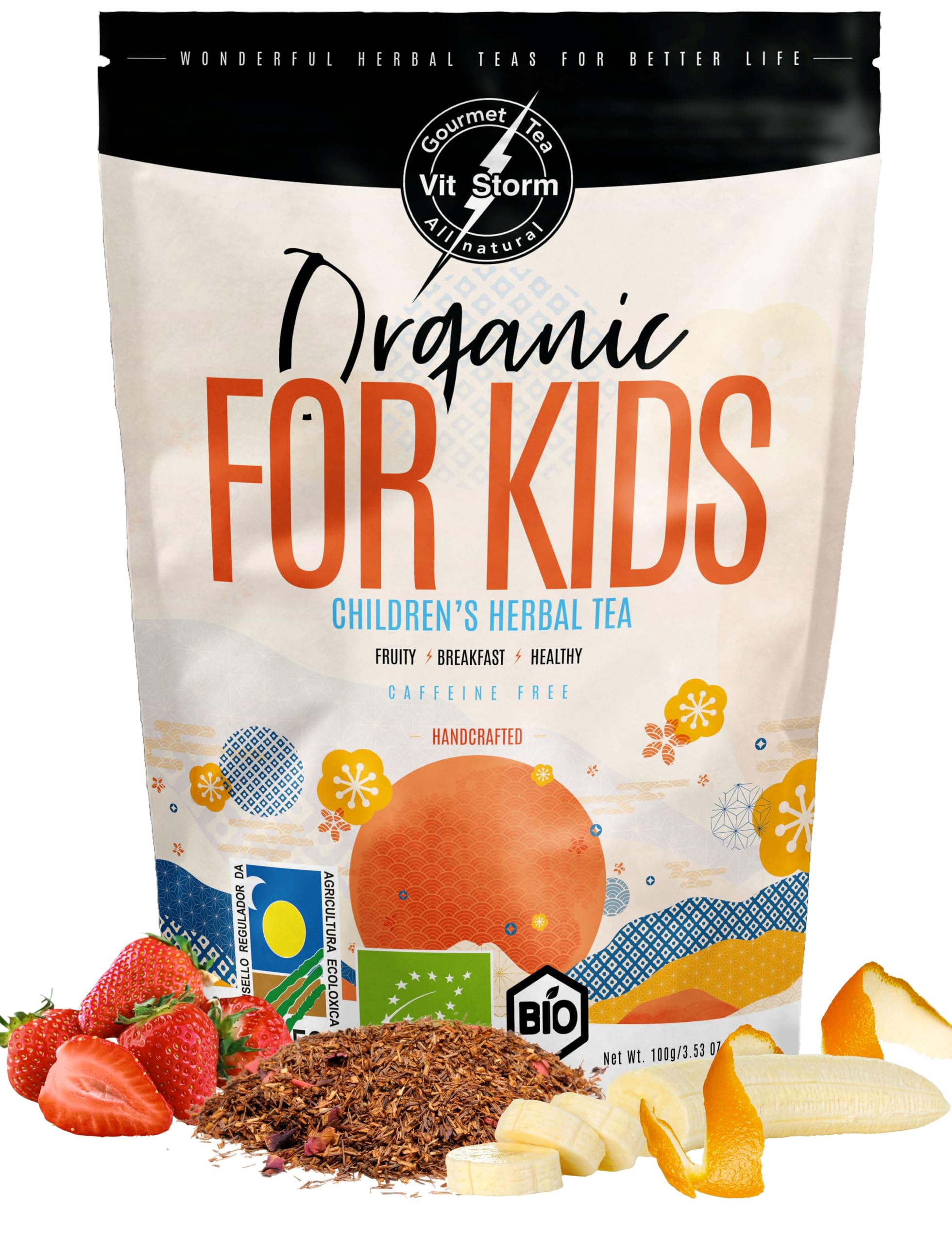 VITSTORM Tisane Bio Enfant - Thé Fruit Rouge, Rooibos, Fenouil, Camomille, Mélisse, Banane, Fraise, Myrtille, Framboise - Tisane sommeil Enfant - Confort Digestif - Sans Théine - Infusion Vrac 100g