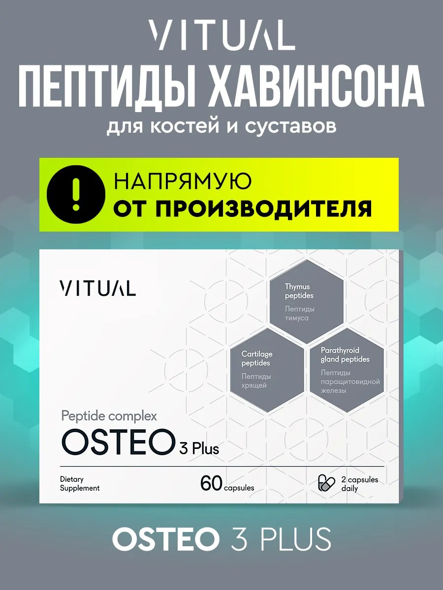 The natural polypeptide complex "Osteo 3 Plus" is designed to maintain normal musculoskeletal function, improve calcium metabolism in the body, and reduce the negative impact of external and internal factors on the musculoskeletal system.