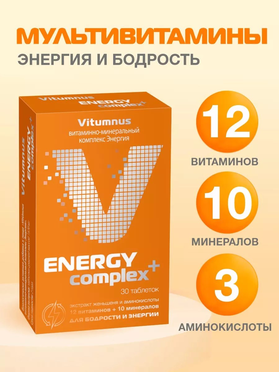 VitUmnus Energy vitamin and mineral complex is a combination of beneficial substances designed to provide comprehensive support, combat fatigue, and restore energy balance. Each tablet contains 12 vitamins, 10 minerals, amino acids, and ginseng root extract—an active combination of natural ingredients to maintain tone and energy throughout the day.