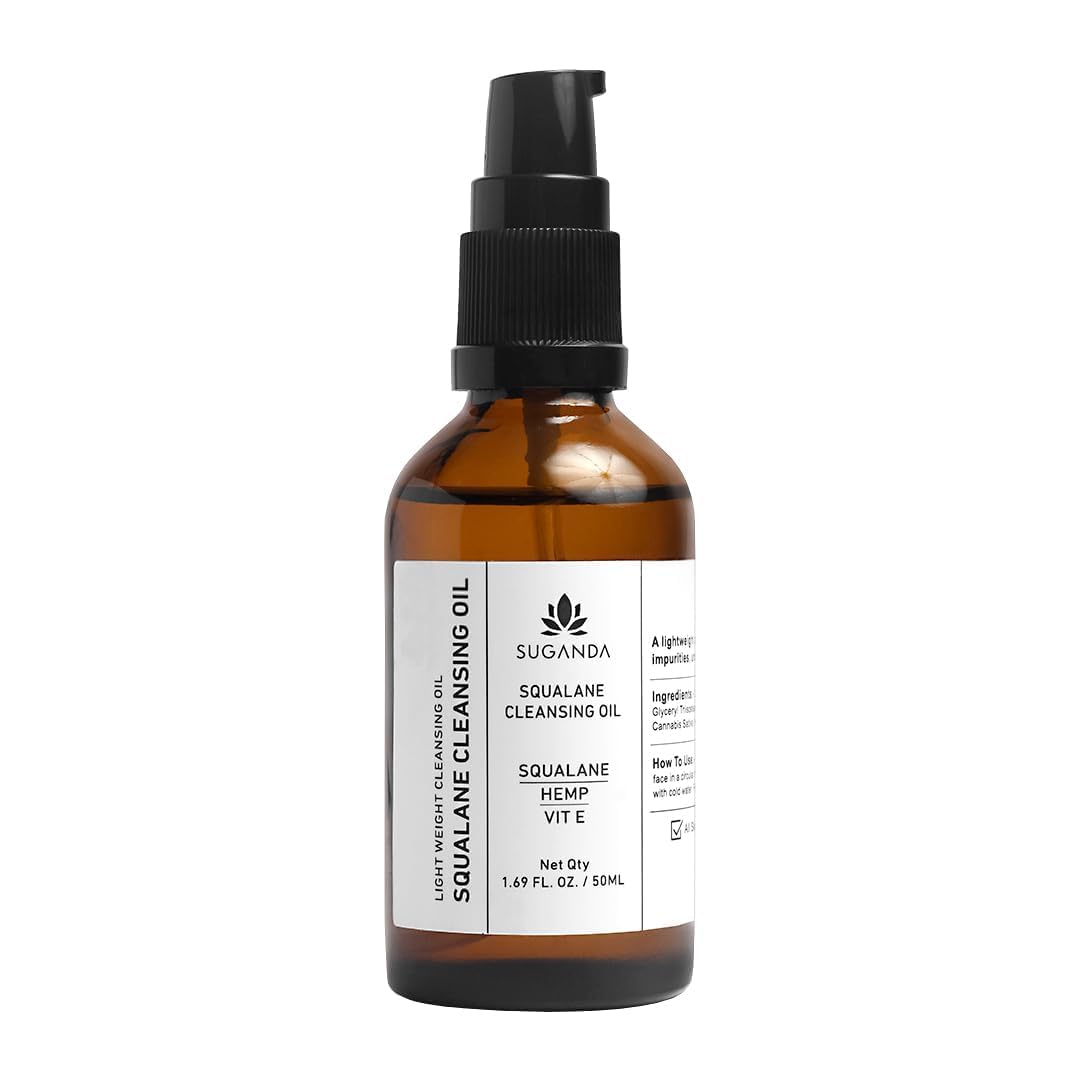 VIVA SKINCARE Suganda Squalane Cleansing Oil, Removes Skin Impurities, Dissolve Oil Based Makeup, Makes Skin Soft Supple, Ensures Pore Remains Unclogged, Men Women (50ml).How to Use: Take 2-3 pumps and gently massage over dry face in a circular motion. After massaging for 1-2 mins, rinse it with cold water. Skin Types: This can be used as a daily cleanser for all skin types including oily skin. Skin-loving Ingredients: It is formulated with Squalane, a type of ingredient that works very much like skin's own oil (sebum) to prevent moisture loss. Hemp oil is perfect for most skin types as it can moisturise without clogging your pores and vitamin E which also has anti-inflammatory properties which naturally enhance the skin's regeneration process. A lightweight oil that transforms on skin. It melts away makeup, oil other impurities without making the skin feel greasy, cleanses while leaving skin feeling soft nourished.