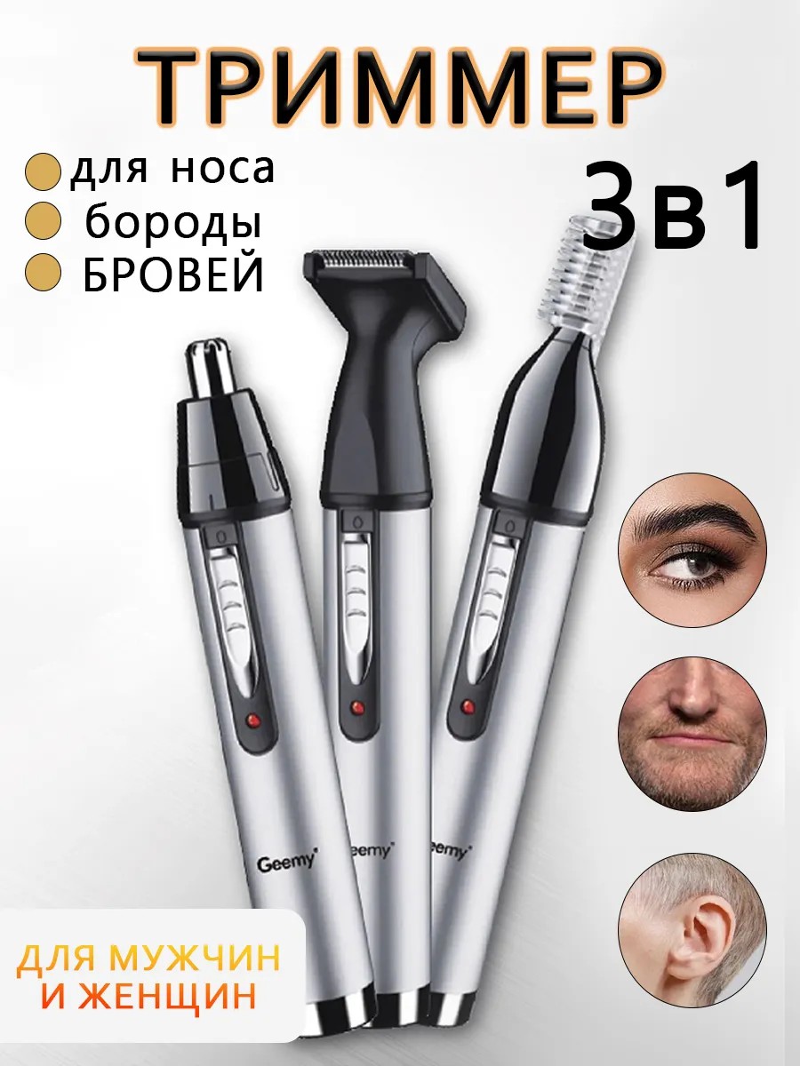 Электрический триммер бритва 3 в 1 с тремя насадками для удаления и стрижки волос из носа и ушей бровь, для стрижки и окантовки подбородка, усов на лице отличная замена бритва для носа. Триммер - машинка для бровей могут использовать как мужчины, так и женщины как аксессуар. Данный стайлер - машинка относится к бытовой технике по уходу за телом и может использоваться как для бритья и чистки лицевой части тела, так и интимных мест, одной из которых является зона бикини. Время зарядки около 6 часов. Универсальный электробритва не имеет открытых лезвий, что делает ее безопасной. Корпус сделан из металла и имеет серебристый цвет. В набор входят: электрический триммер, шнур (провод) для зарядки, три моющиеся насадки, кисточка для очистки, и расческа в подарок. Для очистки - необходимо снять насадку и почистить ее кистью или под проточной водой. Этот прибор станет отличным подарком на любой праздник!