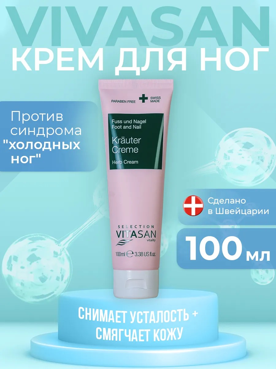 Vivasan foot cream with chamomile and mint effectively relieves tension and moisturizes your feet, restoring their lightness and freshness. The formula with natural extracts soothes skin after a long day and is suitable for daily foot care.