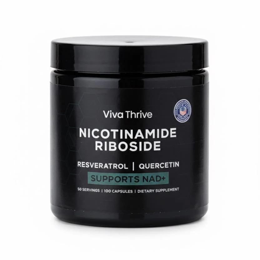 Experience Advanced Cellular Energy Longevity Support. VivaThrive's NAD Complex is a premium NAD supplement crafted for those who want to feel sharper, younger, and more energized—every single day. Featuring 500mg Nicotinamide Riboside (NR), 150mg Resveratrol, and 250mg Quercetin, this high-potency formula supports your body's natural NAD production, helping boost cellular health, mitochondrial function, and energy metabolism. Unlike basic NAD or liposomal NAD, NR is a clinically studied ingredient shown to be 50x more effective than NAD and 5.4x more effective than liposomal NAD at raising NAD levels. Whether you're just starting your NMN supplement journey or exploring powerful NAD supplements for women and men, VivaThrive delivers. Each bottle contains 100 capsules, providing a 50-day supply when taken as directed. With 3 bottles, you're set for 5 months of consistent mitochondrial and anti aging support. VivaThrive is made in the USA, in our lab in New York City, and every batch is third-party tested for quality and safety. You're getting clean, potent, and trustworthy ingredients. Backed by a money-back guarantee, this is NAD advanced support you can trust. Try VivaThrive risk-free and discover what NADH, NMNH, and optimized NAD levels can do for your mind and body. These statements have not been evaluated by the Food and Drug Administration. This product is not intended to diagnose, treat, cure, or prevent any disease.Money back gaurantee - We stand behind every bottle of VivaThrive. If you're not satisfied for any reason, simply let us know, we'll refund your full purchase, no questions asked. It's risk-free support for your NAD , NR, NMNH, or NAD supplement routine. You've got nothing to lose and more energy, clarity, and cellular health to gain. 50-Day Supply, 100 capsules of NAD support. 3 bottles give you over 5 months of powerful support. A smart choice for anyone looking to do more with their NMN supplement, NAD , or NAD supplement stack. VivaThrive is your daily dose of high-quality NAD Plus support—no fillers, no fluff, just results. Made in USA Third-Party Tested for Purity Potency – Proudly manufactured in a state-of-the-art facility in New York City using premium globally sourced ingredients. Every batch is third-party tested in the USA for heavy metals, quality, and consistency, with Certificates of Analysis available on request. A great choice for those seeking high-purity NAD supplements for men, NAD advanced support, NADH supplements, NMNH alternatives, and products that help maintain cellular function as part of a longevity-focused routine. CLINICALLY STUDIED FOR ENERGY, FOCUS VITALITY – Nicotinamide Riboside (NR) is 50x more effective than NAD and 5.4x more than liposomal NAD at raising NAD levels. Backed by clinical research, NR supports cellular health, metabolic function, and mitochondrial energy production. Feel the difference in natural energy, focus, and recovery within weeks. A high-performance mitochondrial supplement, and a powerful alternative to NMN and NMNH. VivaThrive is a trusted NR supplement, ideal as NAD supplements for women and men, and a top anti-aging NAD supplement for men. VivaThrive delivers a potent NAD Complex: Our NMN Supplement Alternative boasts a true synergistic NAD supplement formula, including 500mg Nicotinamide Riboside, 150mg Resveratrol, and 250mg Quercetin per serving. This daily NAD booster is designed to support cellular energy, brain and muscle function, and healthy aging by naturally elevating NAD levels, which decline with age. Each bottle contains 50 servings—a full 7 weeks of powerful mitochondrial support for enhanced cellular health, energy production, and resilience during everyday stress.