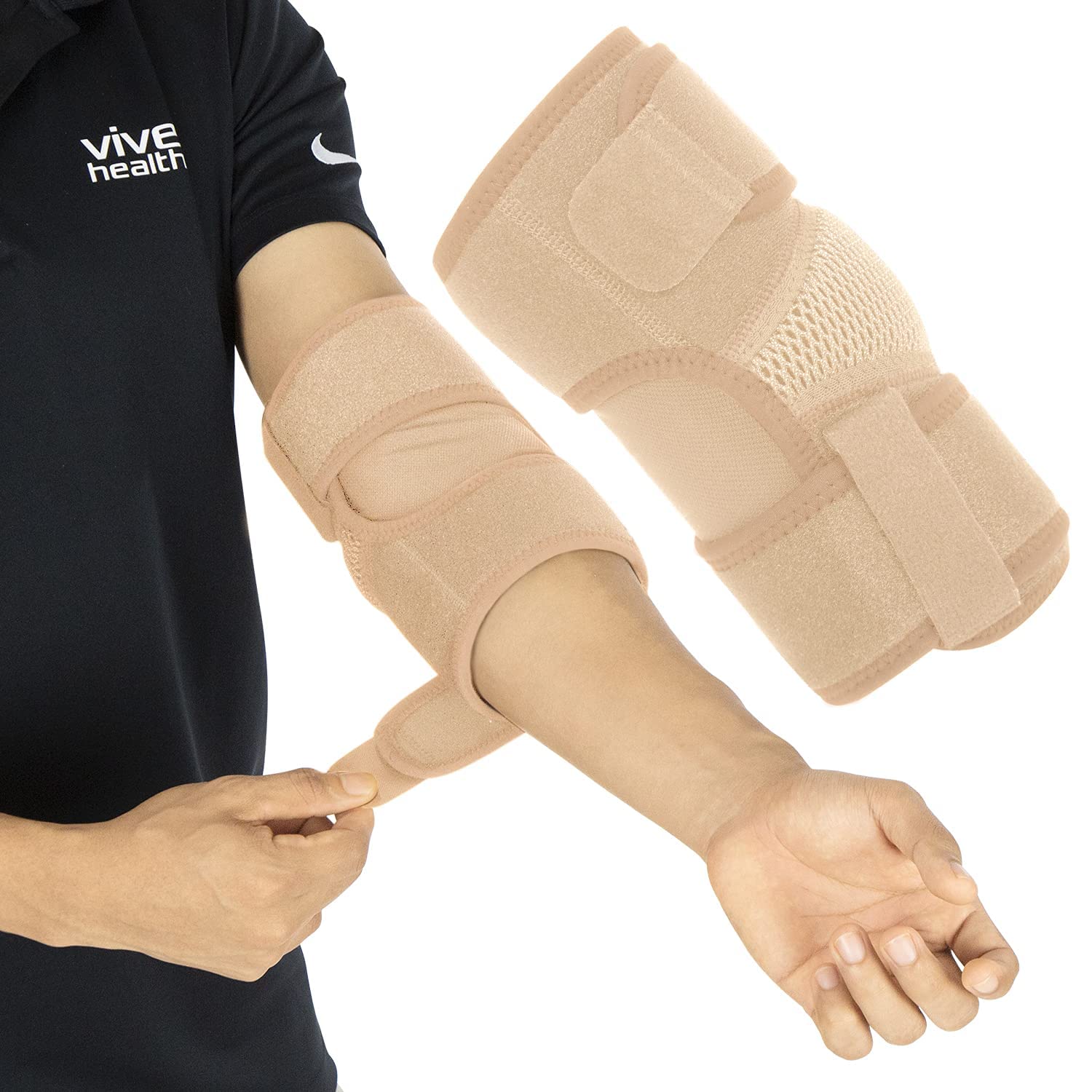 Elbow Brace Reducing pain, swelling and inflammation, the Vive elbow brace supports and stabilizes the elbow with light interior padding and adjustable compression. Ideal for active individuals suffering from tennis elbow, tendonitis, strains or repetitive motion injury, the reversible elbow support wrap features strong fastener straps and silicone ribbing to prevent twisting, sliding or bunching for greater comfort throughout any activity. The lightweight brace is constructed with a latex-free blend that is breathable and machine washable. Stabilizing Elbow Support: Supporting the elbow joint and tendons, the Vive elbow brace stabilizes the elbow and provides customizable compression to reduce pain, swelling and inflammation. Effectively relieves pain due to tennis elbow, tendonitis, bursitis, strains or other injuries without limiting the range of motion in the elbow for optimal support throughout the day. Adjustable Compression Brace: Supplying therapeutic compression, the elbow support brace increg circulation and reducing inflammation and swelling. The level of compression is customizable with the adjustable fasteners. Reversible Fit: Worn on the left or right arm, the versatile elbow brace is fully adjustable for a customized fit up to 17.5” in arm circumference. In addition to the nonslip interior lining, each adjustable strap includes a strong fastening material to ensure a secure fit throughout any activity. Breathable and Lightweight: Constructed with a light padding, the elbow brace is soft and breathable for all-day comfort. The latex-free blend features a soft interior lining to protect the elbow crease and silicone ribbing to prevent the brace from slipping, twisting or sliding. The lightweight, reversible brace is also machine washable for added convenience. What’s Included: * Vive Elbow BraceVIVE GUARANTEE: 60 day guarantee so you can purchase now with confidence. BREATHABLE AND LIGHTWEIGHT: Constructed with a light padding, the elbow brace is soft and breathable for all-day comfort. The latex-free blend features a soft interior lining to protect the elbow crease and silicone ribbing to prevent the brace from slipping, twisting or sliding. The lightweight, reversible brace is also machine washable for added convenience. REVERSIBLE FIT BRACE: Worn on the left or right arm, the versatile elbow brace is fully adjustable for a customized fit up to 17.5” in arm circumference. In addition to the nonslip interior lining, each adjustable strap includes a strong fastening material to ensure a secure fit throughout any activity. ADJUSTABLE COMPRESSION SLEEVE: Supplying therapeutic compression, the elbow support brace increg circulation and reducing inflammation and swelling. The level of compression is customizable with the adjustable fasteners. SUPERIOR STABILIZING SUPPORT: Supporting the elbow joint and tendons, the Vive elbow brace stabilizes the elbow and provides customizable compression to reduce pain, swelling and inflammation. Effectively relieves pain due to tennis elbow, tendonitis, bursitis, strains or other injuries without limiting the range of motion in the elbow for optimal support throughout the day.
