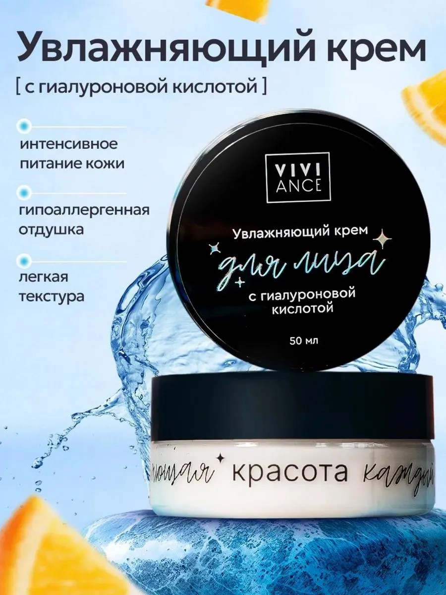 Увлажняющий крем для лица Viviance создан на основе гиалуроновой кислоты и обогащен натуральными маслами ши и авокадо, а также экстрактами клевера, апельсина и зеленого чая. Его уникальная формула направлена на глубокое увлажнение, восстановление, защиту, улучшение тонуса и выравнивание тона кожи.