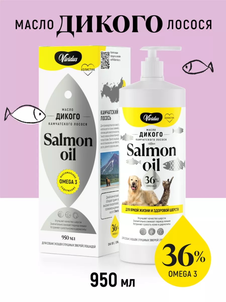 VIVIDUS salmon oil is the only wild salmon oil on the Russian market. This distinguishes VIVIDUS from numerous similar products produced from farmed salmon raised on compound feed containing growth hormones and antibiotics. Wild salmon is much cleaner and more environmentally friendly than its farmed counterpart. Wild salmon also contains more beneficial omega-3 fatty acids than farmed fish. The oil contains approximately 36% omega-3, compared to 10-20% in farmed salmon products. Regular consumption has a beneficial effect on the animal's body, improving the quality of the coat, making it healthy and shiny, shortening the shedding period, reducing joint pain associated with arthritis and arthrosis, strengthening the immune system, and improving appetite. Vividus wild Kamchatka salmon oil has one of the highest levels of OMEGA-3 polyunsaturated fatty acids – 36%. Healthy skin and beautiful coat. Unlike salmon oil, regular fish oil does not contain all the vitamins necessary for dogs and cats. It effectively improves the condition of the skin and coat, leaving it vibrant and shiny, reducing flaking and itching, and promoting faster recovery after shedding. Strong immunity. The oil helps strengthen the immune system of animals (small, medium, and large breeds of dogs and cats, as well as rodents: rats, guinea pigs, hamsters, ferrets, and other domestic and wild animals), providing anti-tumor protection. Flexible joints. Suitable for animals of all ages, including puppies and kittens, this treat will delight. Omega-3 and Omega-6 slow the breakdown of collagen fibers in cartilage and connective tissue. They also act as a natural anti-inflammatory, reducing pain in animals with arthritis. Especially recommended for show animals, animals undergoing intense exercise, and pregnant and lactating bitches! Ingredients: Fish oil, vitamin E