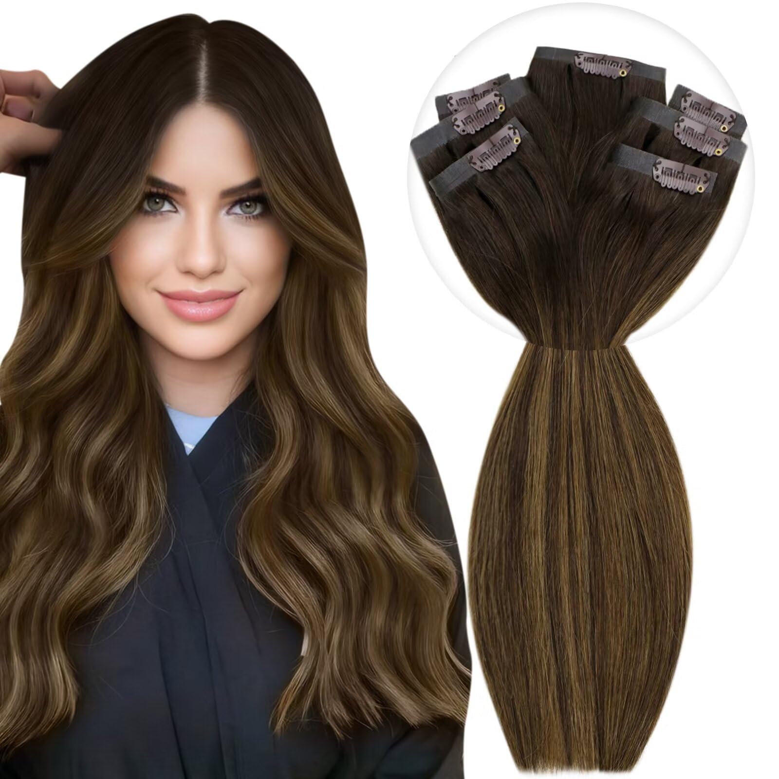 Vivien Pu Clip in Extensions Real Hair Balayage Brown Extensions Clip Real Hair 55cm Dark Brown Ombre light brown and brown real hair clip in extensions 140g #2/8/2 7PCS 22 inch-140g-clip-PU 1-1 CP #2/8/2