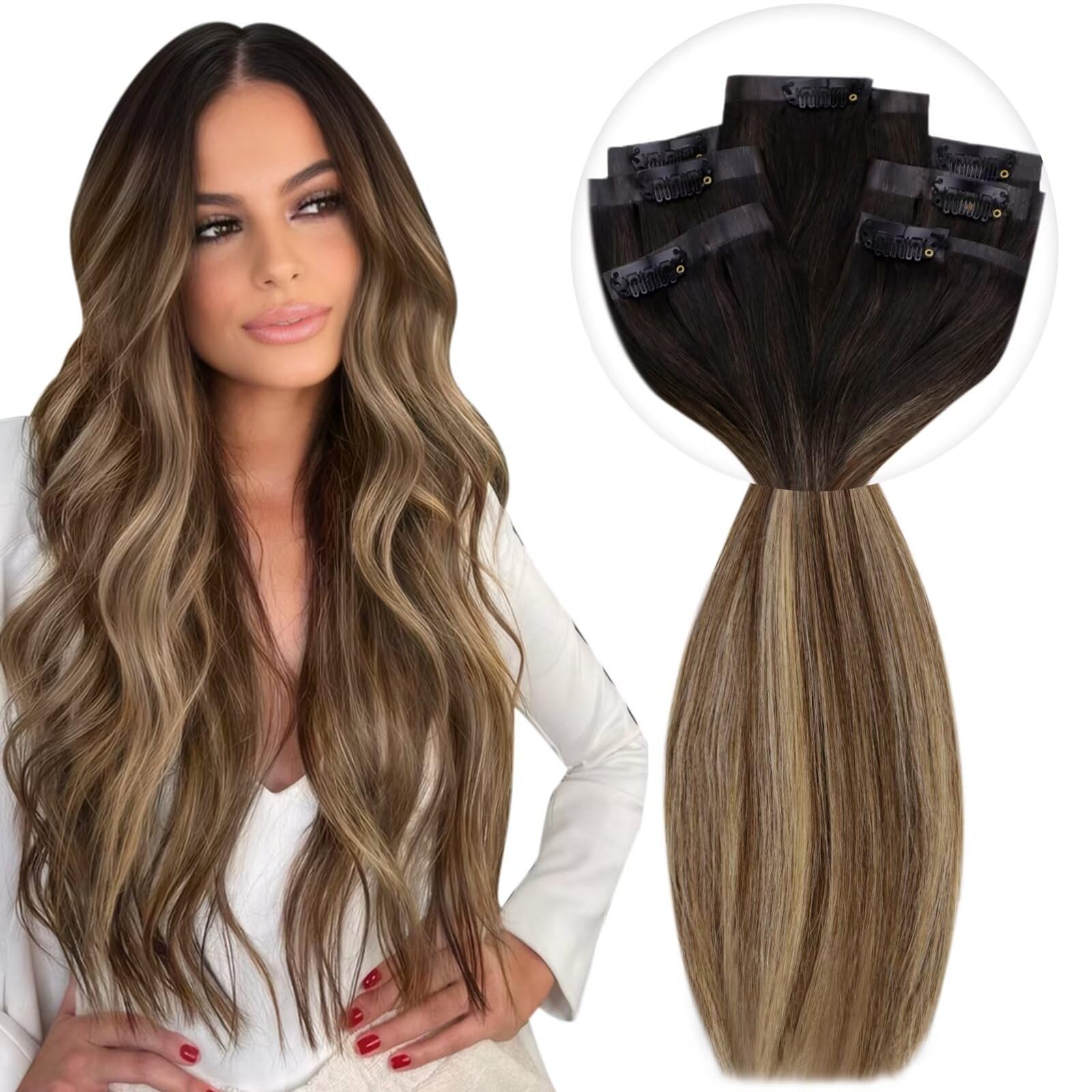 Vivien real hair extensions clip remy extensions clip in real hair brown PU clip in real hair extensions balayage natural black to dark brown with caramel blonde #1b/4/27 40cm 120g/7pcs 16 inch-1220g-clip-PU 1-1 CP #1b/4/27
