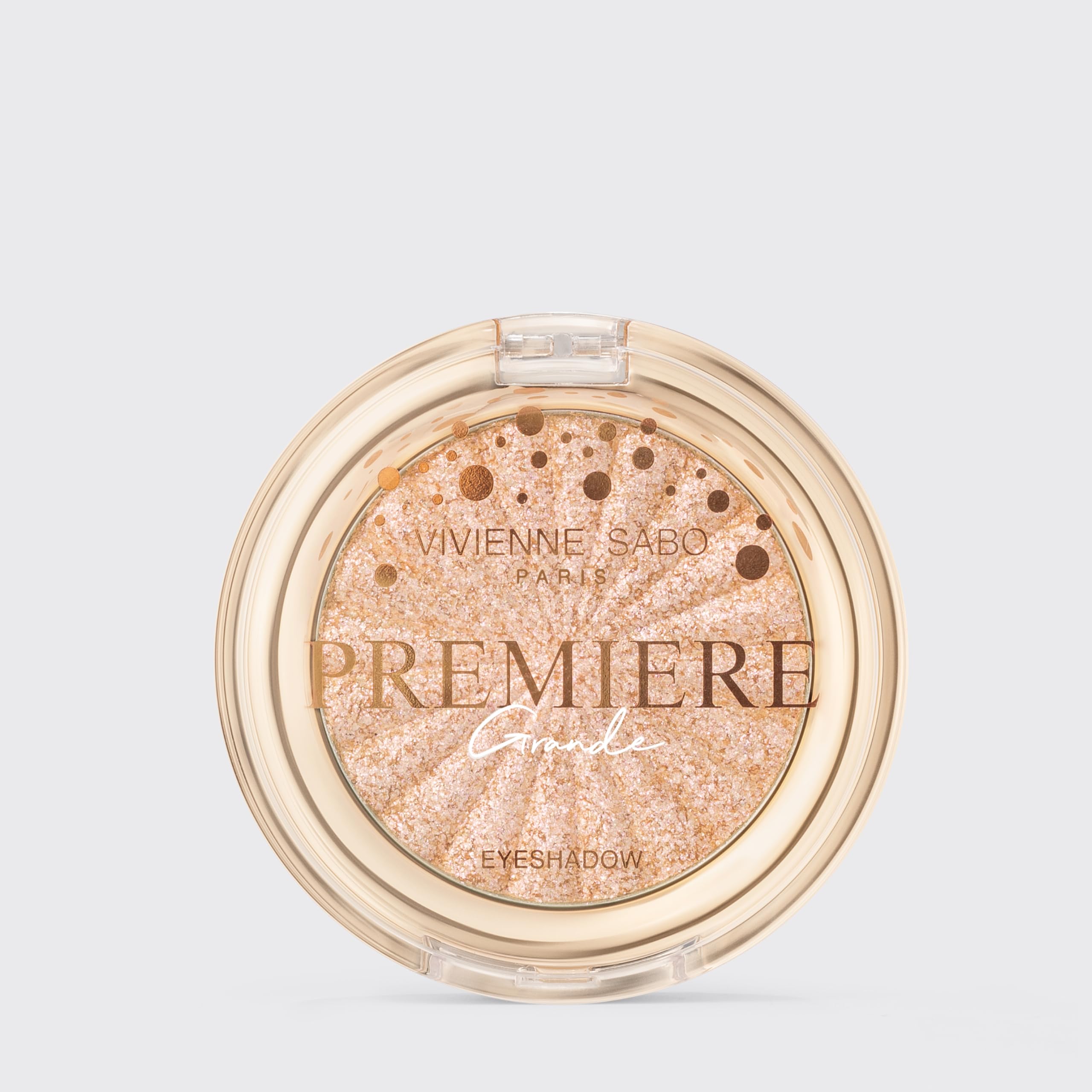 Vivienne SabÓ's Premiere Grande shimmering eyeshadows delicately enhance the depth of the gaze and lend it a touch of mystery. Imagine: the velvet curtain slowly rises, and she steps into the spotlight, a cabaret dancer whose captivating gaze enchants her every move. Her appearance embodies strength and grace, inspiring millions who strive for perfection. On her eyelids lies a delicate rose-gold glow, like the shimmering stage lights backstage, arousing admiration and the desire to unlock the secret of her enchanting beauty. The round case of the PREMIERE GRANDE eyeshadow, like an antique locket, holds the secret of Parisian charm. The transparent lid allows a glimpse of the world's soft glow, while the golden base evokes the luxury that surrounds every cabaret dancer.