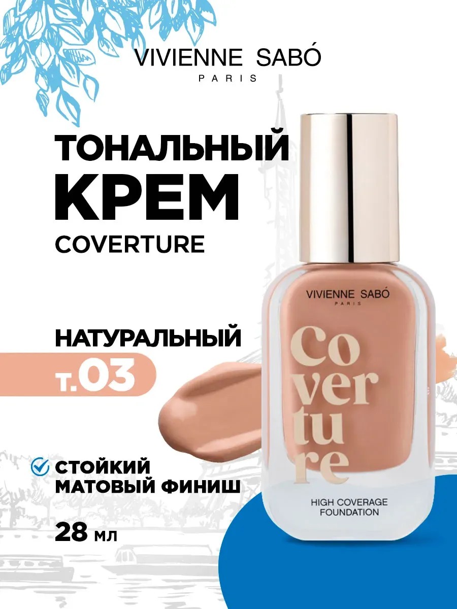 Тональный крем матовый Vivienne Sabo Coverture, тон 03 натуральный. Вивьен Сабо представляет новинку с духом авантюризма - стойкий тональный крем для лица Coverture, который идеально подходит для всех типов кожи. Жаркие танцы, страстные поцелуи и даже долгие неожиданные перелеты — он выдержит любые приключения, и твоя кожа останется безупречной. Тональная основа с высокой степенью укрывистости выравнивает цвет кожи, скрывает несовершенства и создает натуральный матовый финиш без эффекта маски, придавая лицу свежий, отдохнувший вид без лишнего блеска. Корректор скрывает покраснения, прыщики, акне и угри, а также темные круги под глазами, синяки и пигментные пятна. Благодаря своей пластичной кремовой текстуре с матовым финишем, он просто наносится, растушевывается, не подчеркивая морщинки, неровности на коже и шелушения. В коллекции представлено четыре натуральных оттенка, от светлого - до более темного, что позволяет каждой женщине подобрать идеальный вариант. Крем можно наслаивать для создания среднего или плотного покрытия, которое выдержит высокую температуру и влажность летом. Благодаря стильному стеклянному флакону обтекаемой формы с золотой крышкой и дозатором ты сможешь набрать нужное количество продукта. При ежедневном использовании 30мл хватает на 100 дней. ПЕРЕД НАНЕСЕНИЕМ рекомендуем предварительно увлажнить кожу лица кремом за 15 минут до нанесения любого тональника. СПОСОБ ПРИМЕНЕНИЯ: нанесите текстуру по всей поверхности лица подушечками пальцем, спонжем или кистью, начиная с центра, двигаясь к периферии, чтобы скрыть расширенные поры и создать ровный тон. СМЫВАЕТСЯ стойкая текстура гидрофильным маслом. Декоративная косметика подходит для девочек, их мам. Это отличный подарок на 8 марта или день рождения для девушки, мамы, подруги, подростка, сестры, женщины, коллеги. С тональным средством Viviene Sabo каждая женщина сможет подчеркнуть свою красоту и индивидуальность, скрыв несовершенства и придав коже здоровый и сияющий вид!