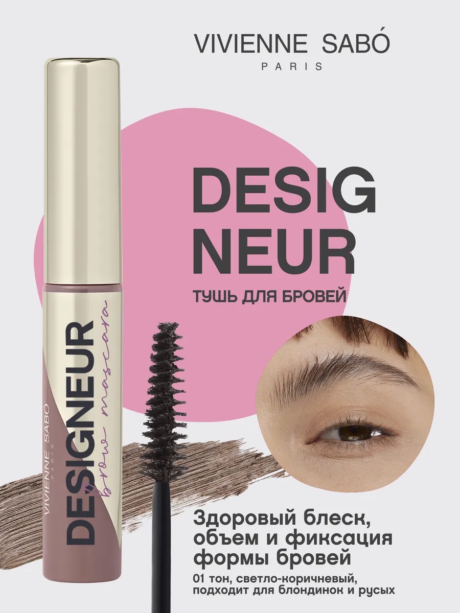 DESIGNEUR eyebrow mascara from VIVIENNE SABÓ is a product that will help you create thick, well-groomed brows for any occasion, transforming makeup into a true art form, allowing anyone to feel like a true brow artist. This mascara coats each hair and delivers rich color, adding healthy shine and volume to brows. Thanks to its unique particles, it blends harmoniously with your natural brow color and gently defines their shape. The mascara's formula contains moisturizing ingredients that care for the hairs and skin around the brow area and protects against harmful environmental factors. DESIGNEUR mascara is available in light brown and taupe shades. It comes in a stylish, glossy bottle with accent details that match the mascara's color. Vivienne Sabo makeup is not tested on animals. HOW TO USE: Gently fill in all hairs with light, upward strokes, moving along the brow from the widest part at the bridge of the nose to the narrow temple. To add thickness, fill not only the hairs but also the skin between them, using light strokes with the brush in the direction of growth. The classic small brush is easy to fill in brows of any width and create a long-lasting, microblading-like look. Discover the secret to perfect brows with DESIGNEUR by VIVIENNE SABÓ and forget about problems with hold and styling!