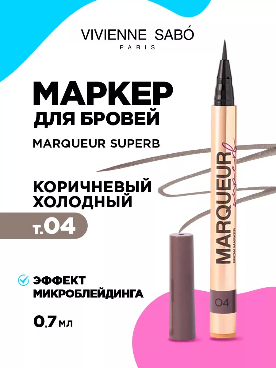 Vivienne Sabo Маркер для бровей Marqueur Superb, тон 04 коричневый холодный. Объём: 0,7мл. Вивьен Сабо - бренд, известный своими качественными и доступными средствами для макияжа. Одним из их бестселлеров является маркер для бровей Marqueur Superb. Этот продукт идеально подходит для тех, кто хочет создать густые и выразительные брови без посещения салона красоты. Маркер для бровей коричневый Marqueur Superb представлен в четырёх оттенках – светло-коричневый (тон 01), темно-коричневый (тон 02), светло-коричневый холодный (тон 03) и коричневый холодный (тон 04). Тона подходят для блондинок, русых, шатенок и брюнеток. Карандаш маркер для бровей имеет тонкий фетровый аппликатор, который позволяет рисовать естественные линии, заполняя пустоты между волосками. Таким образом, создается эффект микроблейдинга, и брови выглядят более густыми и объемными. Благодаря своей невесомой текстуре, фломастер быстро высыхает, а насыщенный стойкий цвет держится весь день. Способ применения: тонким аппликатором маркера лайнера дорисуйте недостающие волоски, двигаясь по направлению роста бровей от переносицы к виску или используйте трафарет для бровей. Далее закрепите с помощью геля для бровей от Вивьен Сабо. Возможное применения маркера на лицо в виде веснушек. Декоративная косметика для глаз и бровей от Viviene Sabo гипоаллергенна и прошла офтальмологический контроль. Вивен Сабо придерживается веганской формулы и не проводит тесты на животных. Подходит декоративная касметика для девочек и их мам, а также для создания легкого, но и при этом яркого и красивого макияжа лица подросткам для всех типов кожи. Идеально подойдёт как подарок маме, девушке, женщинам, внукам, подруге, кто оценит вашу заботу и внимание к мелочам. Vivienne Sabo всегда старается предложить своим покупателям только лучшую продукцию, которая поможет выглядеть безупречно и подчеркнуть свою индивидуальность. Не упустите возможность попробовать подводку для бровей и добавить их в свою косметичку!