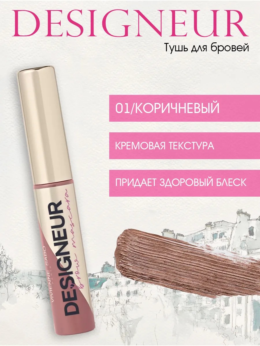 DESIGNEUR тушь для бровей от VIVIENNE SABÓ с обновленной палитрой. С ней ты почувствуешь себя настоящим дизайнером и создашь идеальный образ с густыми ухоженными бровями для любого случая. Тушь обволакивает каждый волосок, делая цвет бровей насыщеннее или приглушая темный натуральный тон, придает здоровый блеск, объем и аккуратно фиксирует форму. Благодаря особым частичкам в кремовой текстуре она сочетается с естественным оттенком бровей. Формула туши содержит увлажняющие компоненты для ухода за волосками и кожей в области бровей, защиты от вредного воздействия внешних факторов. Продукт в светло-коричневом 01 и серо-коричневом 02 оттенке упакован в золотой глянцевый флакон с акцентной деталью в тон туши, а его классической маленькой щеточкой удобно прокрашивать брови любой ширины. Открой для себя секрет идеальных бровей DESIGNEUR от VIVIENNE SABÓ.Аккуратно прокрашивайте все волоски легкими движениями снизу вверх, двигаясь вдоль брови от широкой части у переносицы к узкой височной. Чтобы добавить густоты, прокрашивайте не только волоски, но и кожу между ними, делая легкие штрихи щеточкой по направлению роста.
